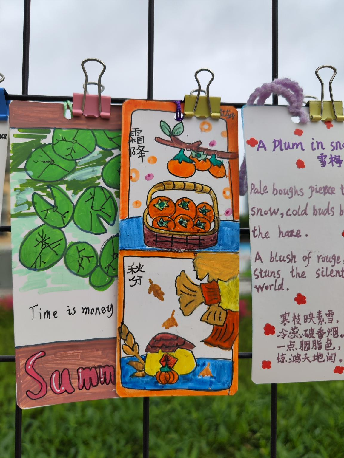 四年级制作四季双语书签,以诗词意境搭配英文短句,文美相融。