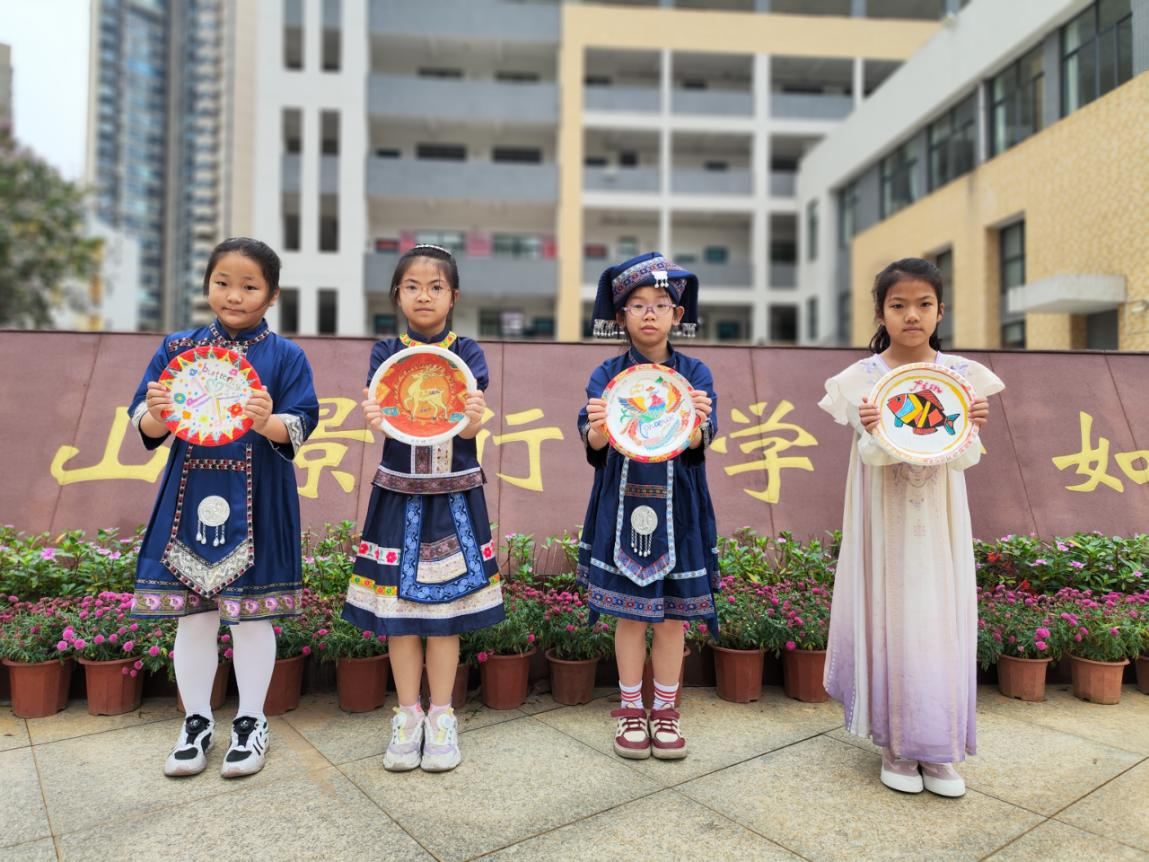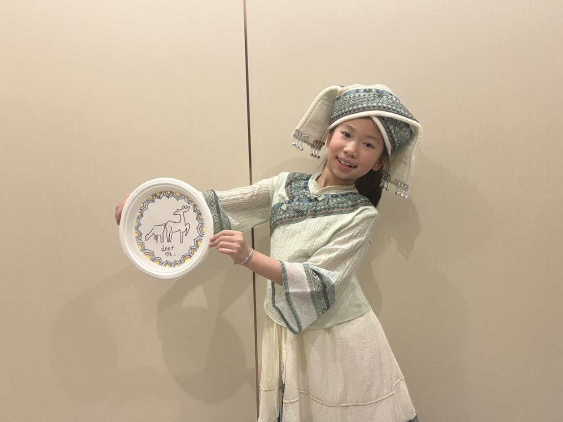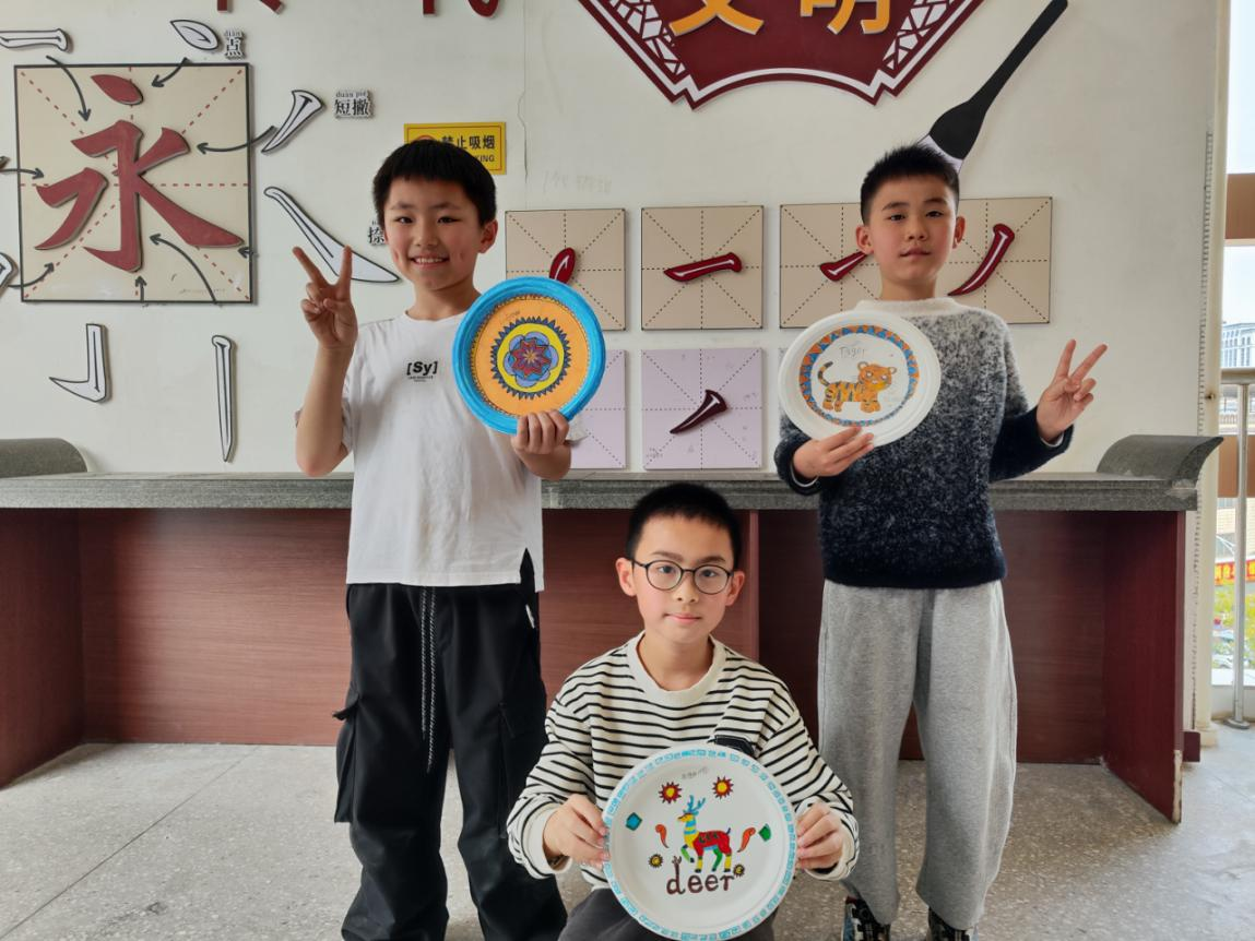 三年级以壮锦为灵感开展壮锦动物盘绘,用英文标注吉祥纹样,让非遗文化跃然指尖。