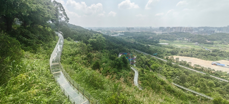 正午阳光晒烫路面,登山顶望高空玻璃滑道。两千余米透明滑道如银河垂落,120 米落差令人震撼,支架隐在树林,露段段"龙身"。老唐指远方:"快看这风光!" 群峰如龙腾跃,水库似龙脊蜿蜒,森林如披风。朵朵数游船,乐乐缠妈妈读指示牌,忽抬头:"这里龙真多。"