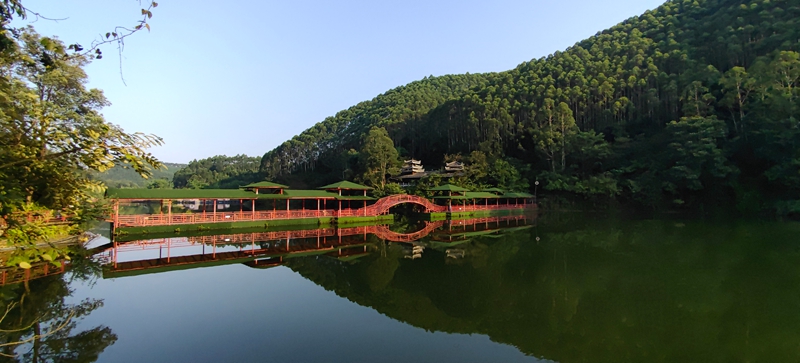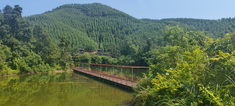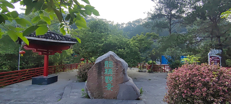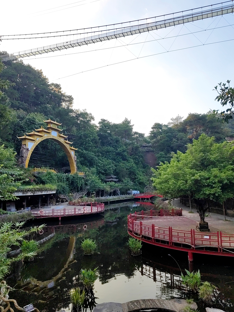 翌日破晓,我起床晨练时,朋友二家人仍酣睡。往山上的水库大坝慢跑,山路上紫花野牡丹沾晨露,花瓣似镀银,空气里草木清香沁肺。越近水库,负氧离子清冽越浓,让人想唱歌。站大坝上,晨雾漫过七百亩水面如轻纱,群峰倒影轻晃,方知"高峡平湖" 是山水呼吸的韵律。对岸玻璃栈道悬在绝壁,护栏镂空龙纹被晨光描亮,如系龙纹玉带。朝阳跃出山头,峡谷崖壁天然龙形石纹忽被镀上金边,像沉睡的龙睁眼,垂藤似龙胡须。