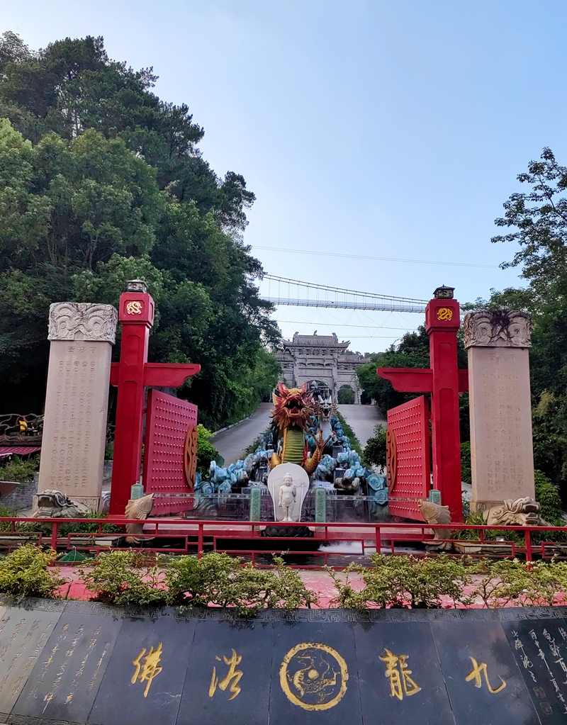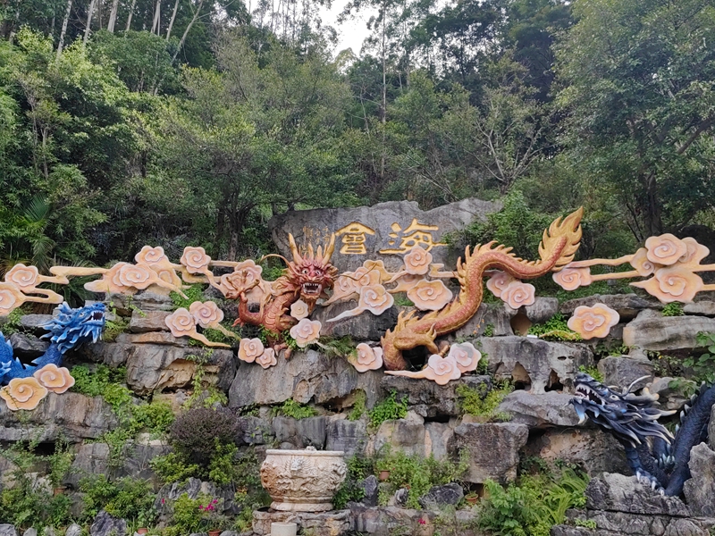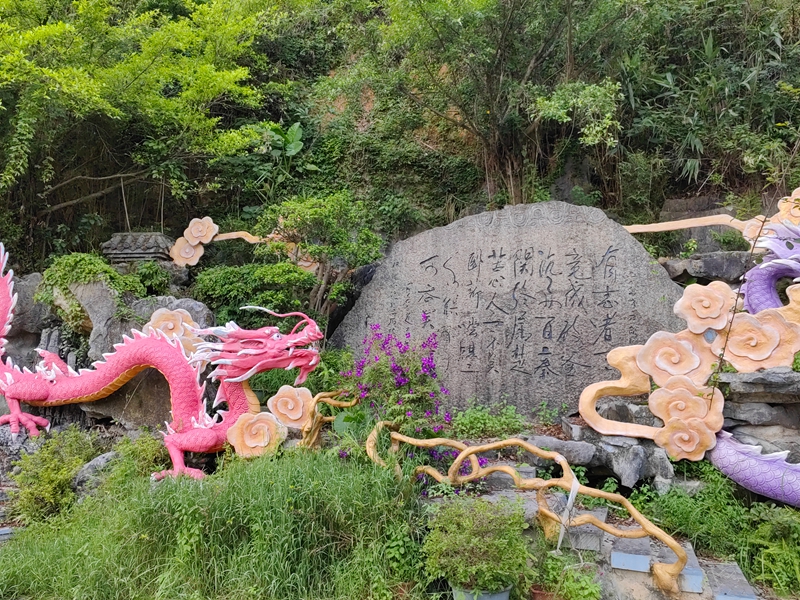三伏天的南宁像熬得酽酽的糖水,柏油路面蒸腾的热浪把远山熨成模糊棉絮。应老黄、老何两家之邀周末去避暑,我裹着一身黏腻,赴约城西三十公里外的龙门水都。车过刻着"龙隐" 的山门,门柱蟠龙石雕正被夕阳镀上金边,鳞爪云纹似在流动。98% 的森林覆盖率织就清凉之网,马尾松与油杉交错成翠屏,风送草木清苦,半程暑气顿消。老何家两个孩子隔着车窗雀跃,女儿乐乐拍玻璃喊"龙要飞啦",儿子俊俊举水枪对准石雕,惹得大人笑揽怀中。