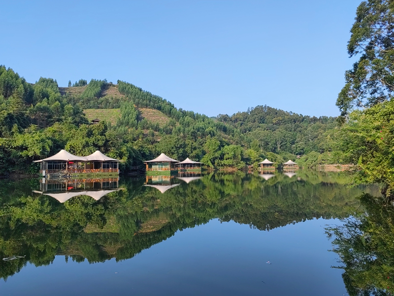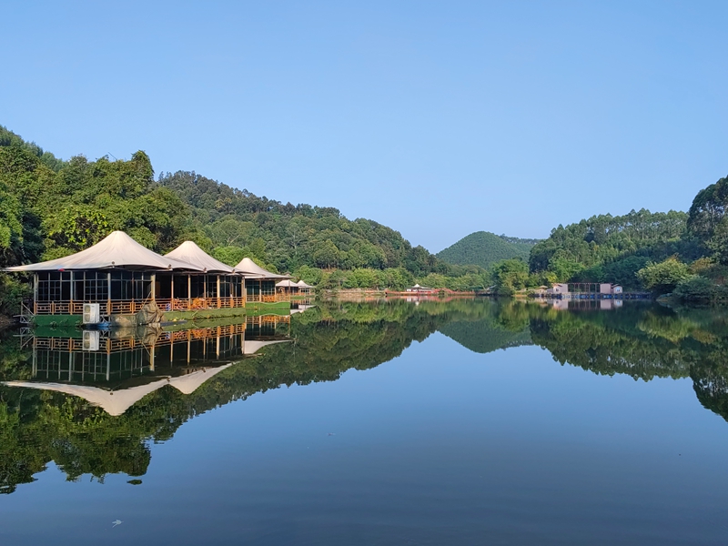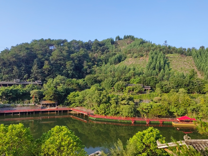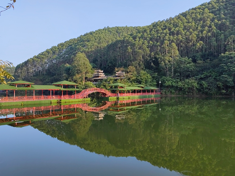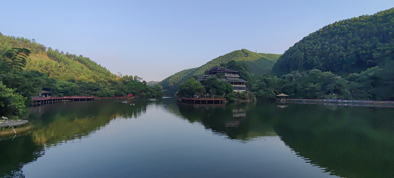 回酒店时,阿明、老黄和家人已坐餐桌旁。我递过手机让他们欣赏美景,老何赞叹道:"这张山峰的照片好像一条龙!"他的爱人笑着递粥碗给他:"看你高兴得像孩子。" 早餐后我们驱车往水库上游游览观光,每到美景处,我们便停车观景拍照。孩子们沿野花山路追着紫花野牡丹、黄色金鸡菊跑。半山腰古建筑门楣龙纹木雕在阳光下发亮,老何仰头指盘旋龙纹:"这龙爪真有劲。" 乐乐接话:"和泳池壁上的一样!" 我们都笑,原来孩子眼睛是最好的发现者。