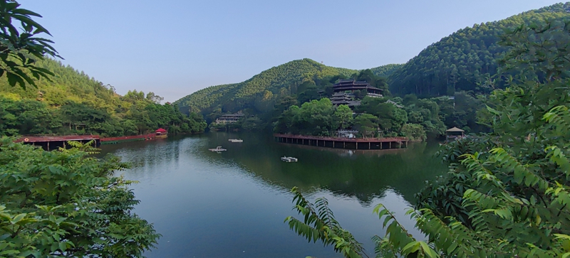 我独自湖边的一小时,让手机照片张张精彩。船过浪痕如龙尾扫过,惊起的白鹭掠过琉璃波光。鹰嘴岩崖壁渗流冲刷出蜿蜒纹路,如龙爪划过。晨雾散后,七百亩碧水在群峰中舒展如醒龙,远山影似伏虎,印证"龙腾虎跃" 地貌。返回时,裤脚沾露却觉轻快,像刚从龙的梦境游出。