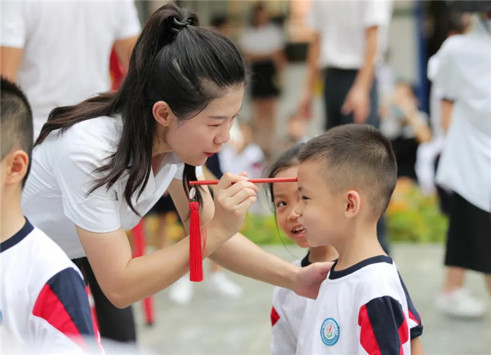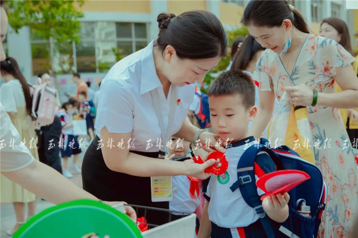 上午7时10分,玉东新区玉东小学在学校小广场举办别开生面的迎新生仪式,“我是小学生啦”的气球背景墙显示仪式感满满。校长陈菁与家委代表、学生代表给萌新们佩戴小红花、送礼物(文明公约卡片),并开心地与孩子们合影。“开学第一天,能和校长妈妈一起合影,我们太开心了!”吴裕翔、吴裕欣这对龙凤胎新生的脸上洋溢着幸福的笑容。