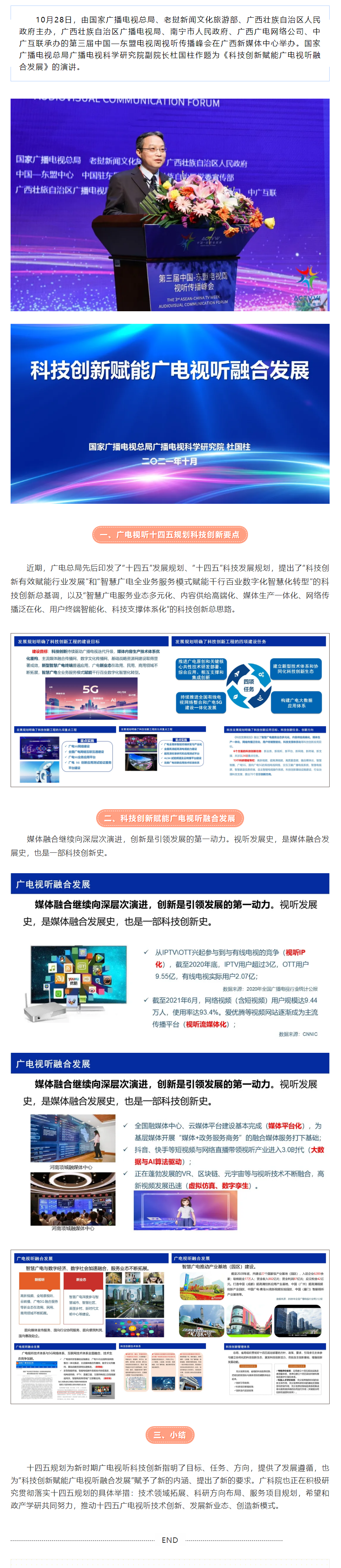 峰会演讲|国家广播电视总局广播电视科学研究院副院长杜国柱作题为《科技创新赋能广电视听融合发展》的演讲