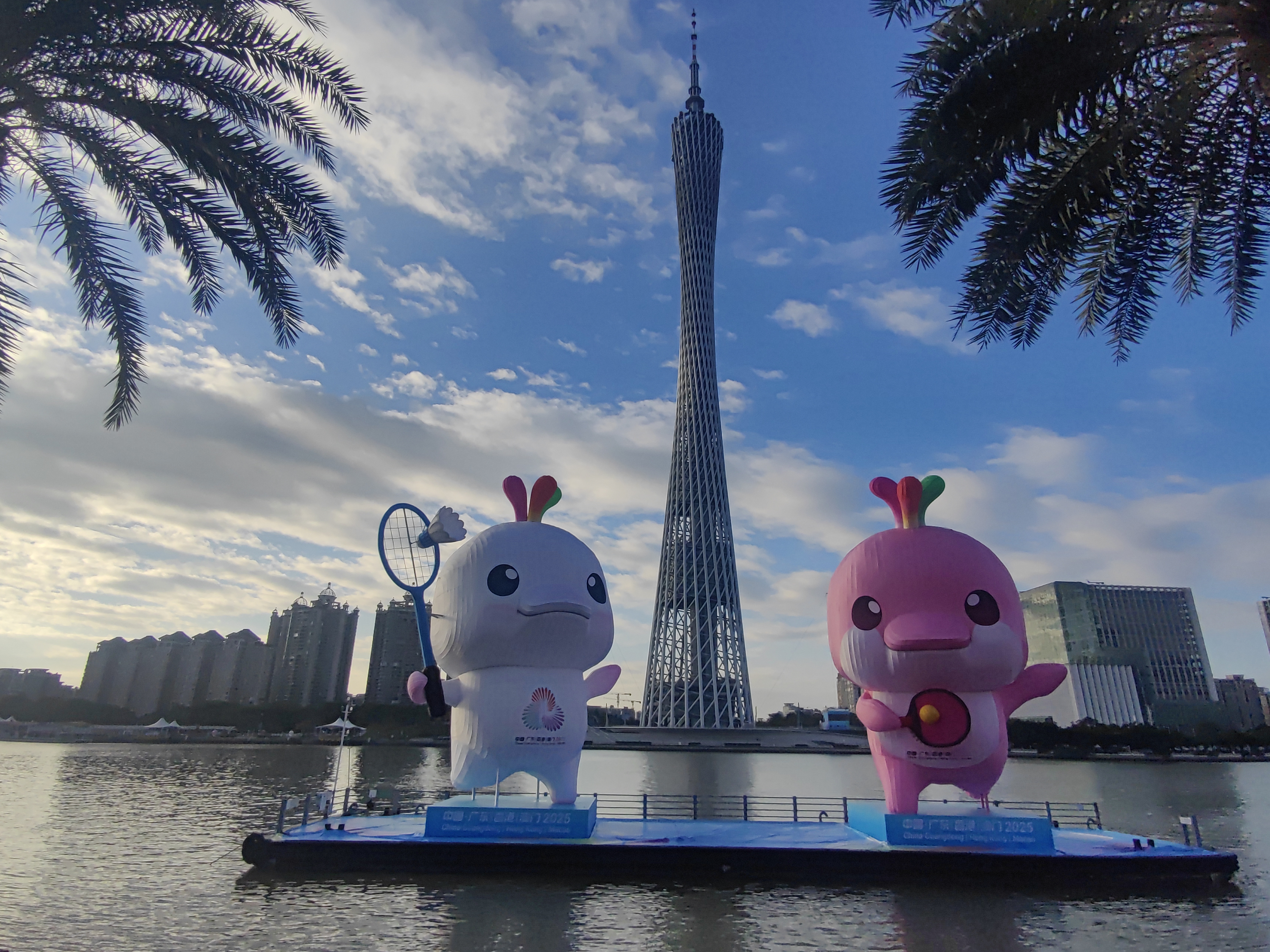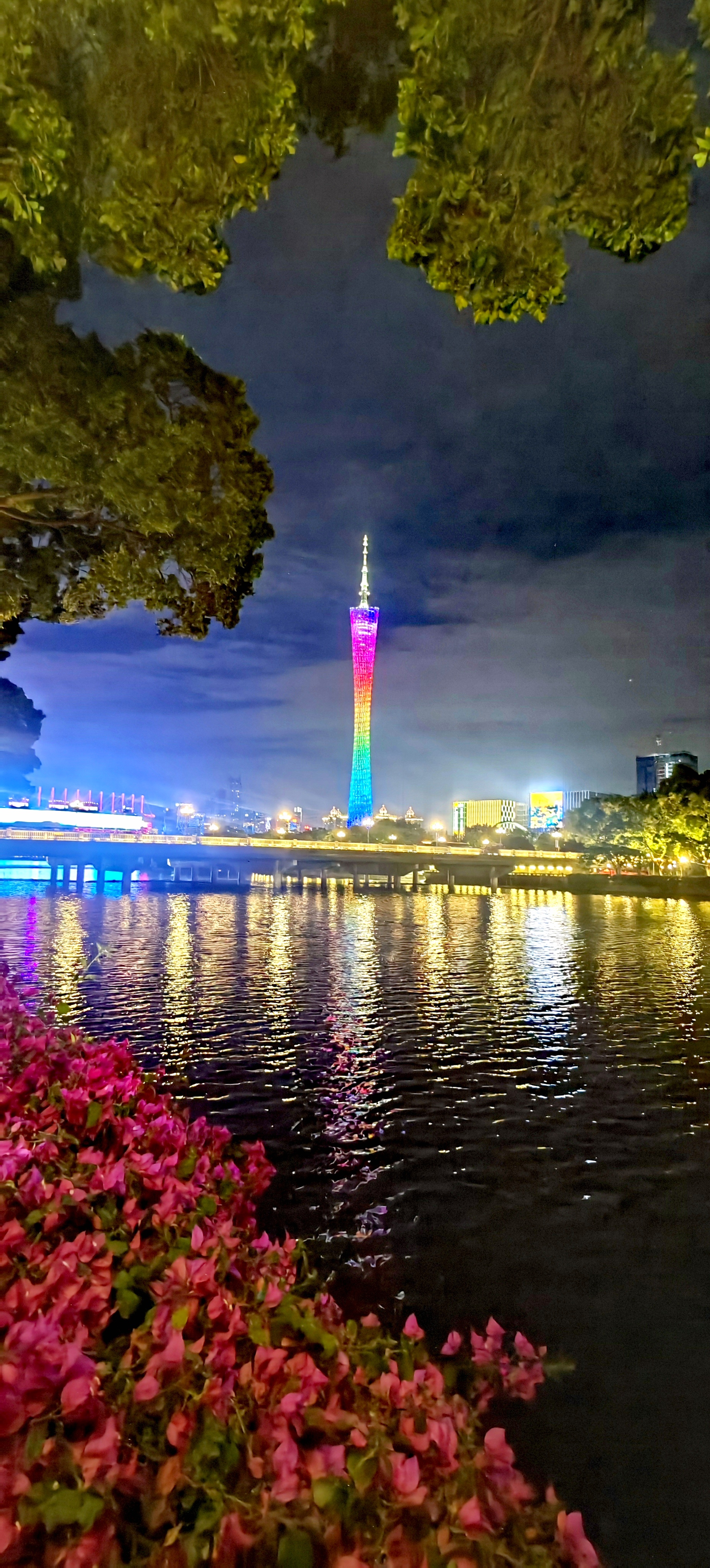 同行的朋友笑说“走,去会会这‘小蛮腰’”。于是我们踱过江边步道。风里裹着三角梅的甜香,全运吉祥物“康康”“乐乐”举着球拍立在花坛边,白的像跃出水面的鱼,粉的似揉碎的晚霞。对岸的体育场亮着暖光,曾是亚运会的主场,如今又接了全运的烟火气。正仰头望时,“小蛮腰”的灯忽然转成鎏金,倒影落进珠江里,碎成一河跳跃的星子——连江水都跟着晃,把楼宇的霓虹、桥栏的暖光,酿成了流动的琥珀。大家纷纷掏出手机拍个不停,我却舍不得按快门:怕镜头装不下这夜的柔。