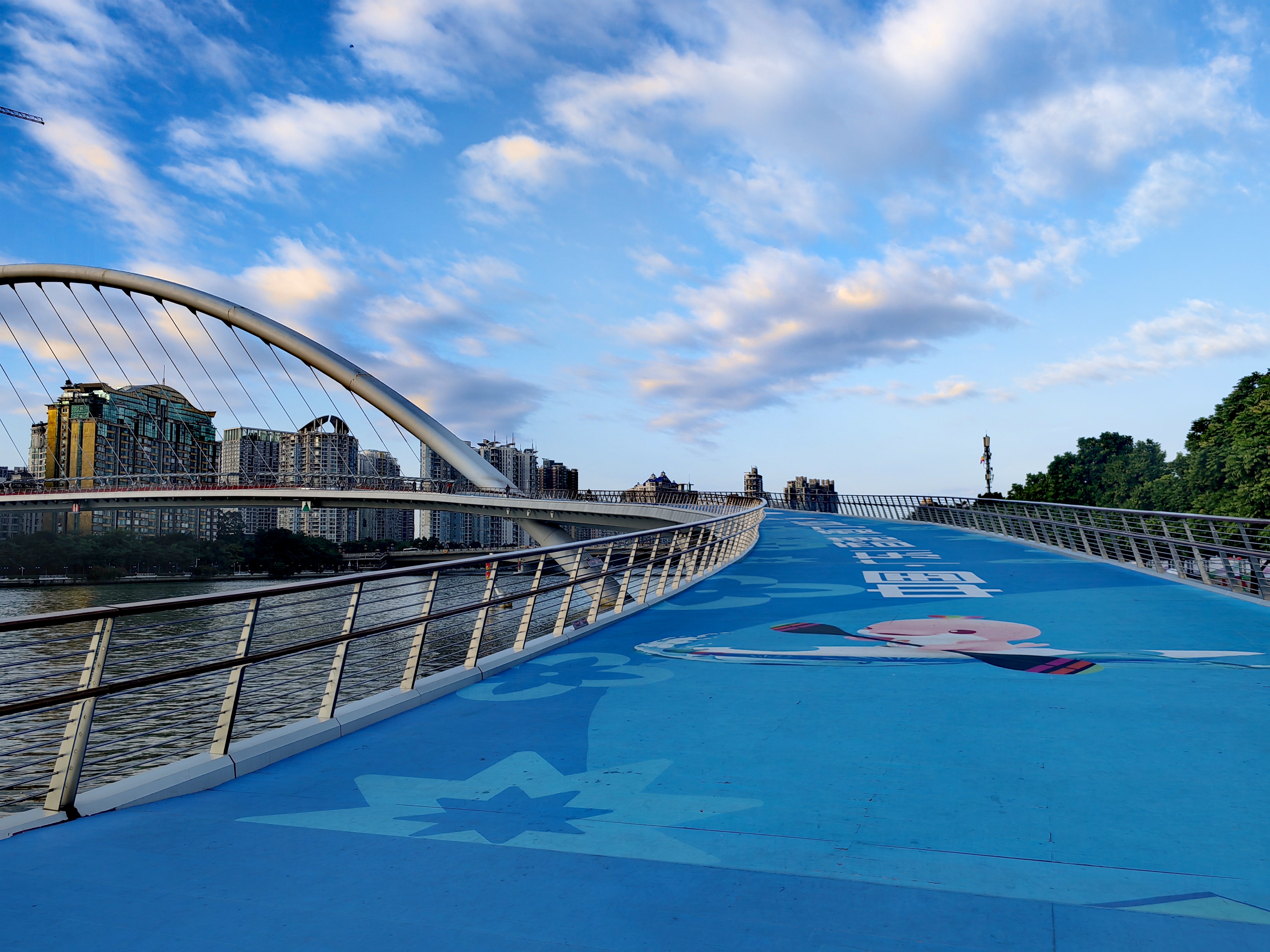 跑到体育场时,晨光刚给小蛮腰镀了层金边。她立矗立在江对岸,钢骨的肌理在蓝天下愈发清俊,流云在她尖顶上游走,连珠江的浪都捧着她的倒影,温柔得不像话。我拐上海心桥,桥身的钢索牵着云,脚下的蓝道嵌着全运的星标,栏杆边坠着的红花开得正艳——原来大都市的浪漫,是让钢铁森林里开满花,让赛事的烟火气揉进晨雾里。