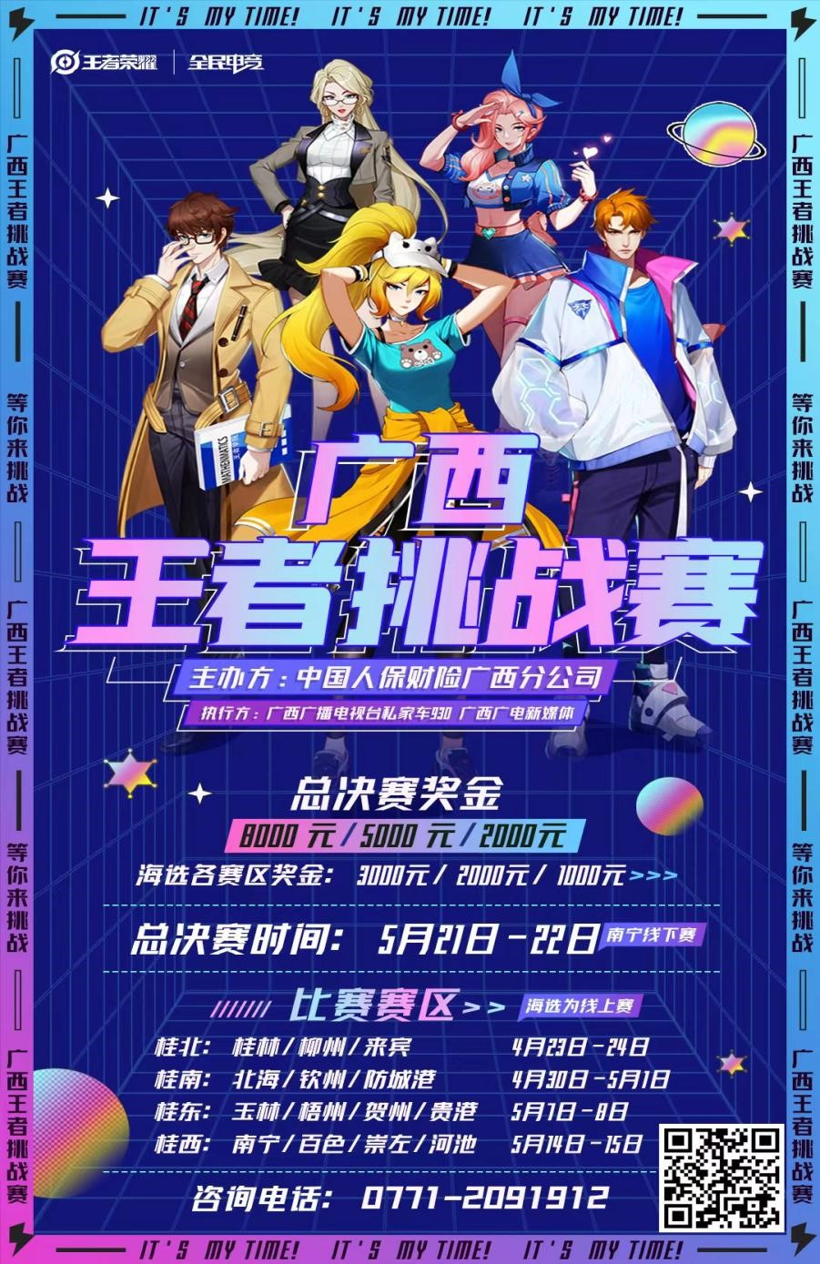 4月23日至5月15日为四大赛区海选赛线上BO1淘汰赛,整个赛事都将在“广西人保财险”视频号全程直播,海选赛决出四大赛区冠亚季军共12支战队。线下总决赛,将在南宁印象城盛大举行。
