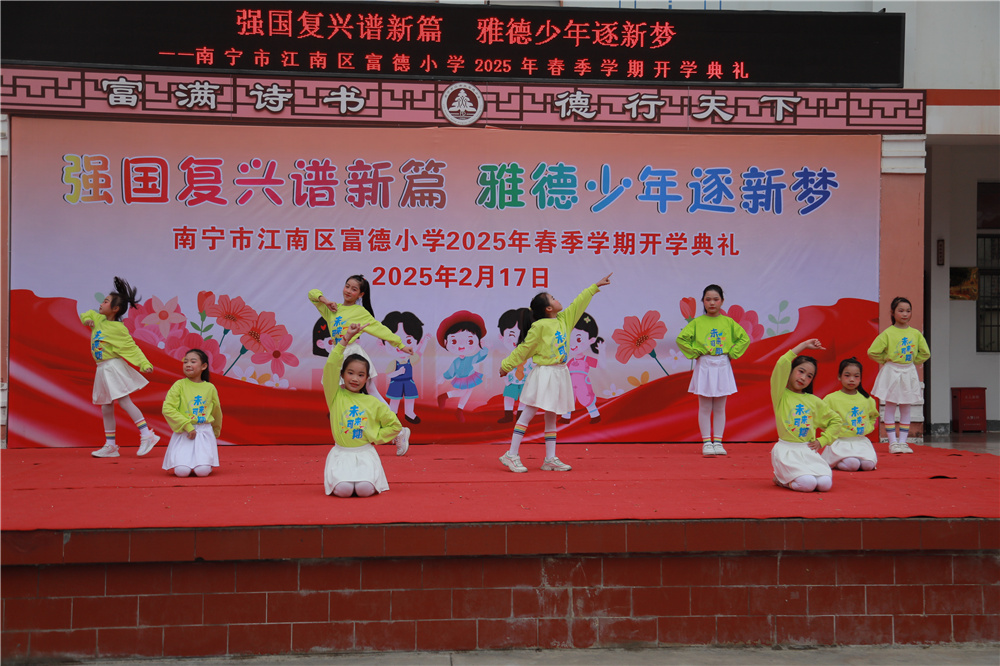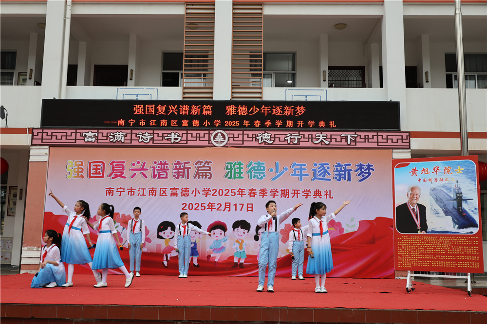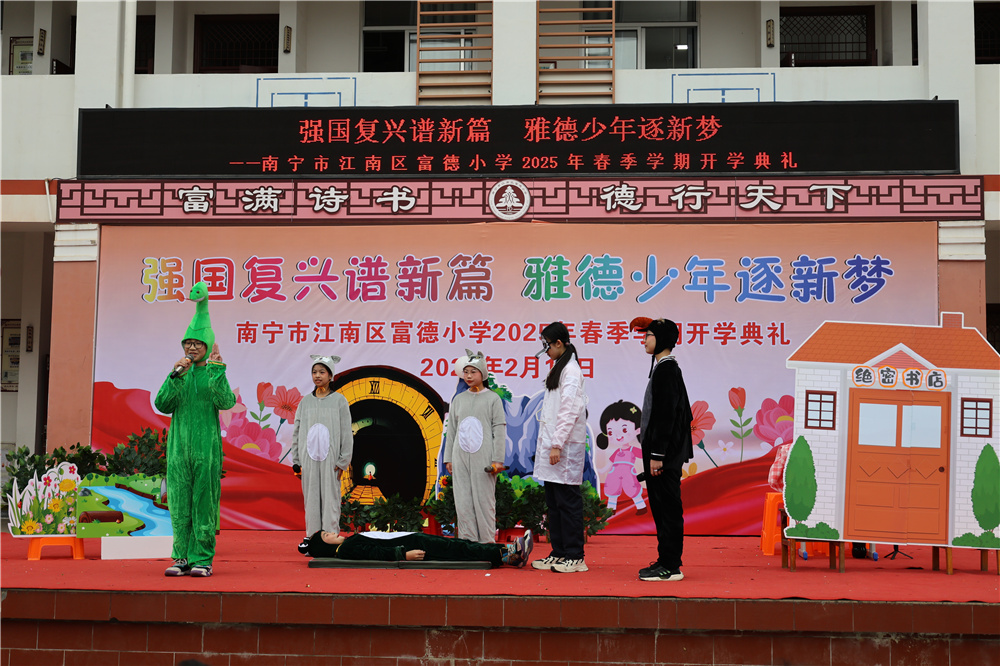 开学典礼上,雷在学校长深情地为全体师生送上新学期祝词,饱含着对同学们的关爱与期望,鼓励大家树立远大理想,努力学习,勇敢追梦,为强国复兴贡献自己的力量。开学典礼节目围绕“强国复兴有我”大主题精彩展示,用朗诵《潜海英雄颂》讲述核潜艇之父黄旭华英雄故事,学习他赤城的爱国精神、无私奉献、执着追梦的优秀品质,激励雅德少年勇敢追梦。结合学校特色阅读活动及蛇年生肖,学生表演奇幻冒险剧《从天而降的小蛇》,鼓励同学们实现自我价值,拥有直面黑暗的勇气,激发学生的阅读兴趣。舞蹈《少年乘风》、小合唱《少年有志》展示富德学子们的自信与活力,表达着对新学期的热爱与期待。