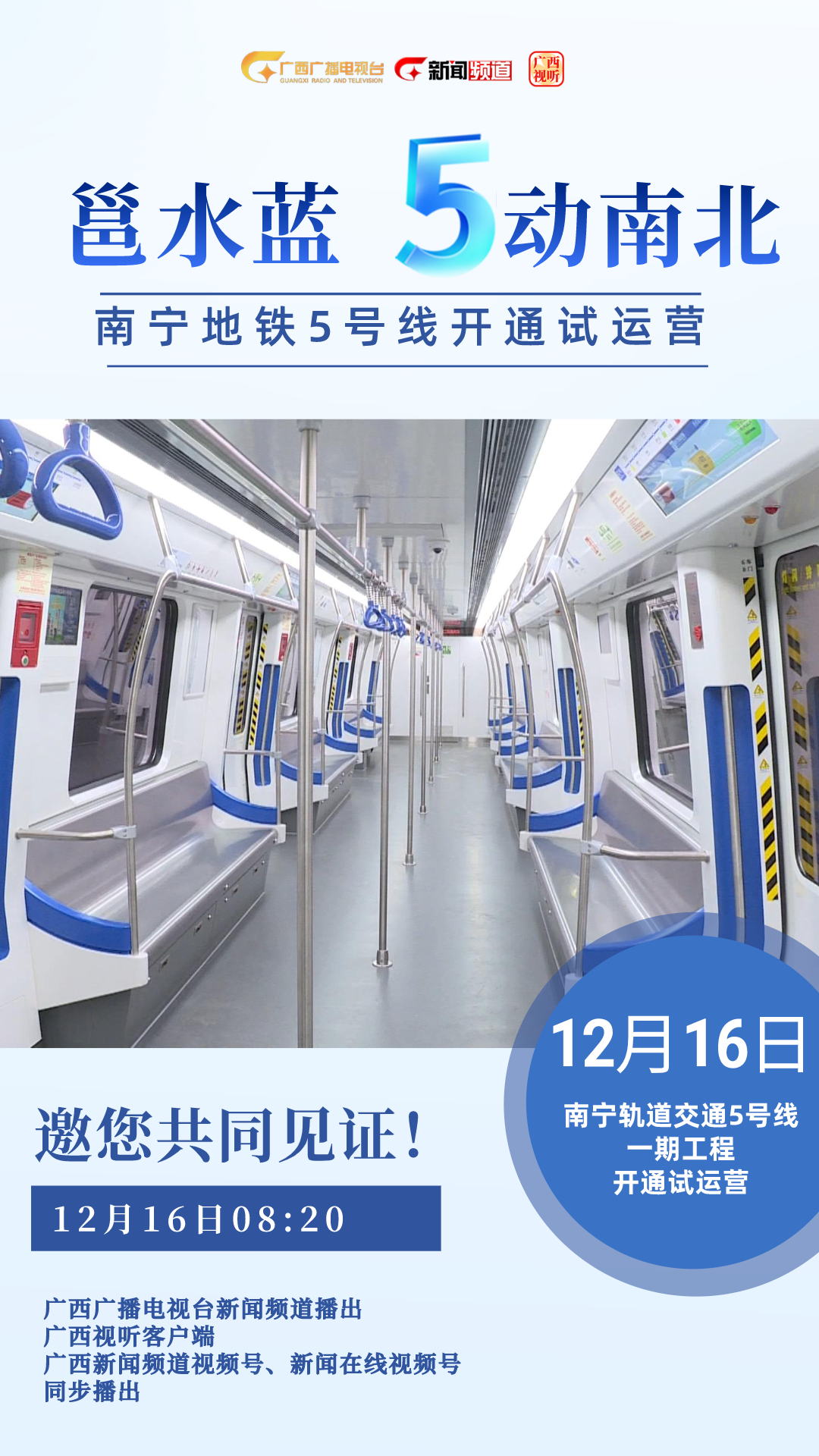 南宁地铁5号线正线全长20.2公里,南起国凯大道站,北至金桥客运站,是连系南宁西南—东北方向的骨干线。作为广西乃至华南地区首条全自动运行线路,明天,广西广播电视台新闻频道5位主持人将在第一时间带你一起感受不一样的5号线。