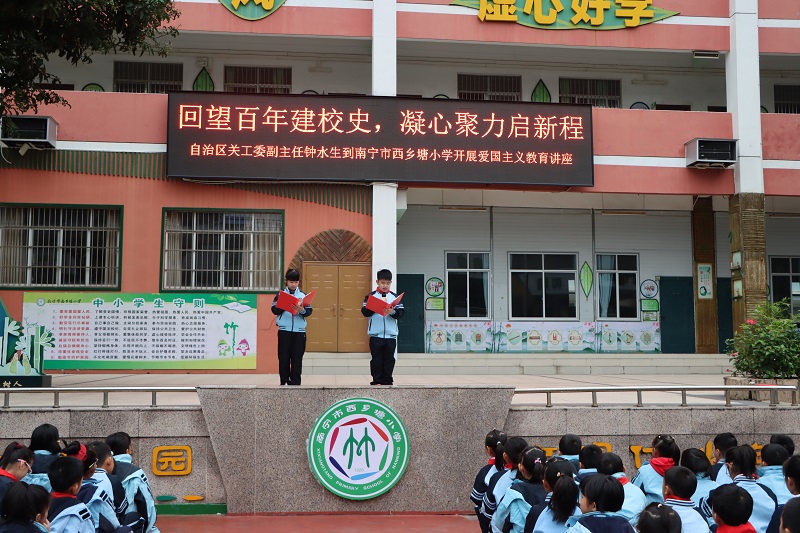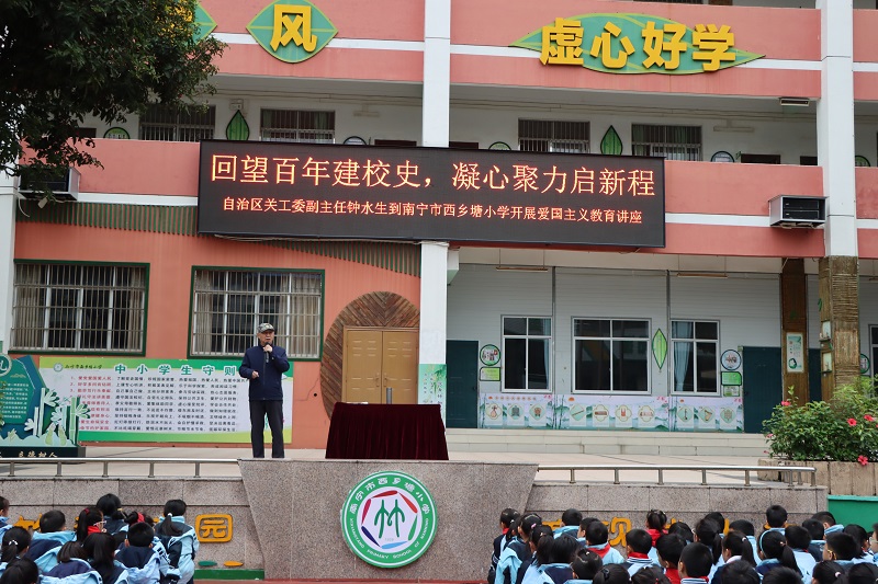 校长讲话后,自治区关工委副主任钟水生登台授课,其精彩讲解蕴含着深切期望与温暖指引,赢得阵阵掌声。恰逢学校建校100周年之际,钟水生副主任和郭珍校长共同为建校100周年标志性雕塑揭牌,全体师生共同见证这一历史性时刻。