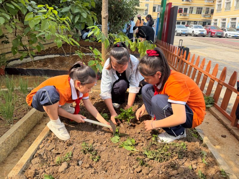 仪式后,各班到学校中草药种植劳动学园种植中草药。家长代表与劳动老师手把手指导,孩子们分工合作,完成翻土、挖坑、放苗、覆土、浇水等步骤,种下薄荷、艾草、紫苏、金银花等中草药。虽然孩子们的动作还是很稚嫩,但眼神里却满是认真和专注。那一刻,我们看到了爱的传递,看到了教育的力量。
