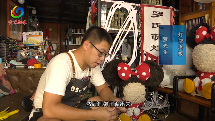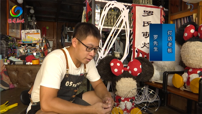 【灯店老板 罗先生】以前的(传统)灯笼是拿竹子做,现在就是拿铁丝,以前的灯笼装的蜡烛,现在我们是装LED 的灯,它就不容易烧起来,以前是没有灯。我做的铁丝(灯笼)更结实一点,外形方面就多了,不单单只是以前那种兔子,现在是五花八门,动画片里的卡通人物,想做什么就可以做什么。