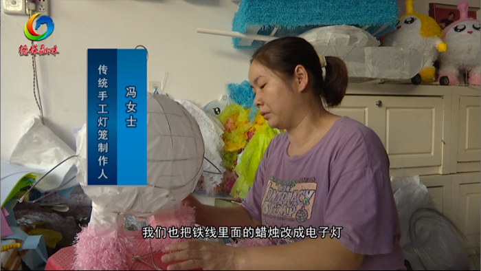 【传统手工灯笼制作人 冯女士】像现在这种(兔子灯笼)我们都改造过了,不像以前,以前使用竹子,后面就改造成用铁线做,铁线做呢,我们也把铁线里面的蜡烛改成电子灯,这样的话,小朋友就可以拉得久,散出来颜色也更漂亮,而且像以前老人做的兔子(灯笼),兔毛做得很粗糙,也没那么好看,现在我们改良过,做成比较细的,剪得也比较细,效果会更好些。