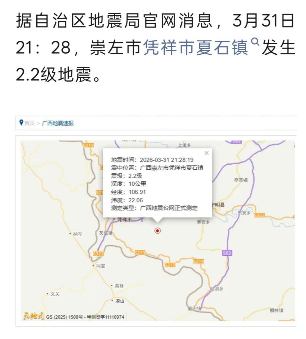 凭祥市夏石镇发生2.2级地震