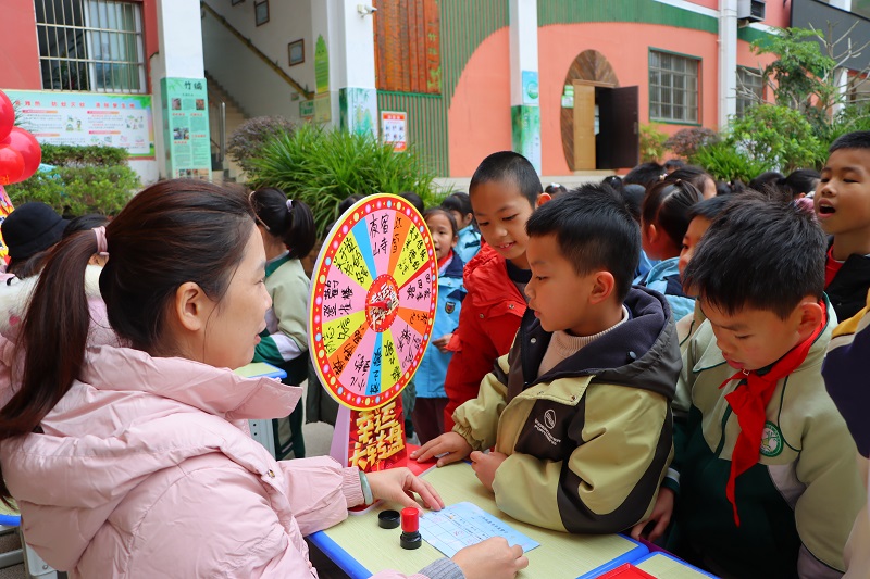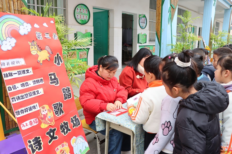 本次嘉年华共设多个闯关环节,涵盖语言表达、数学思维、动手实践等多方面能力培养。语文类关卡如“拼音快跑”“小马识途·汉字探秘”“字词闹新春”等,鼓励学生大胆拼读、组词,锻炼语言运用能力;“课文背诵关”和“小马观图驿站”则着重培养孩子的记忆力和语言组织能力。数学类关卡如“口算速答”“动手拨珠”“图形摸摸箱”等,通过速算、操作计数器、辨认立体图形等形式,增强学生的数感与空间观念。活动现场,孩子们手持闯关卡,踊跃参与,脸上洋溢着自信与喜悦的笑容。
