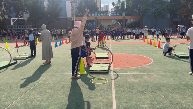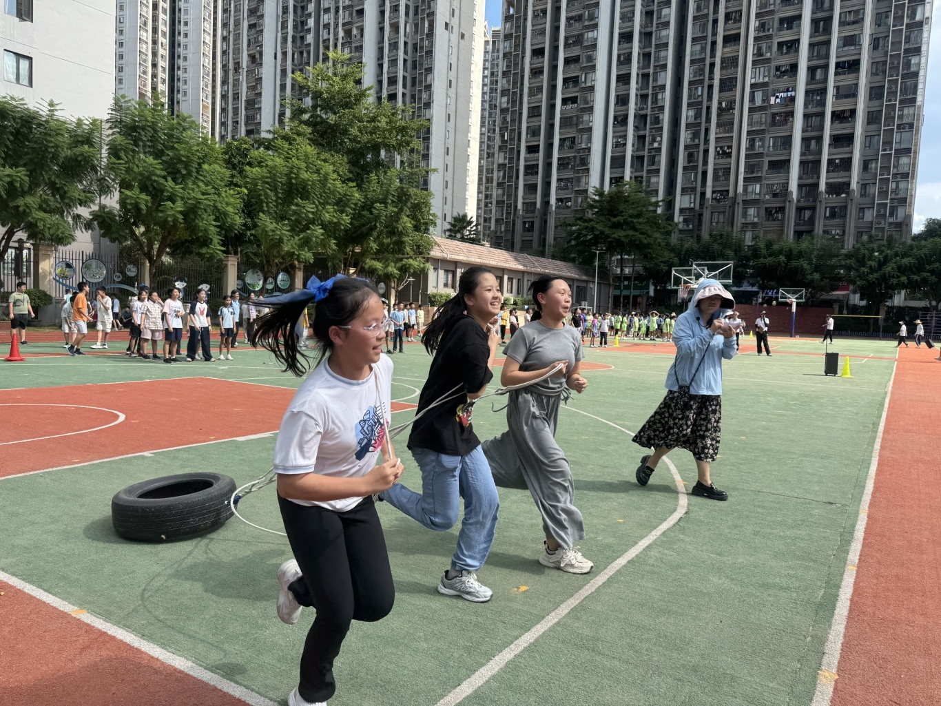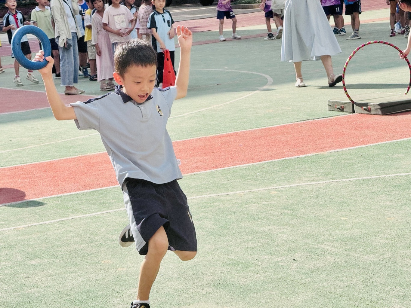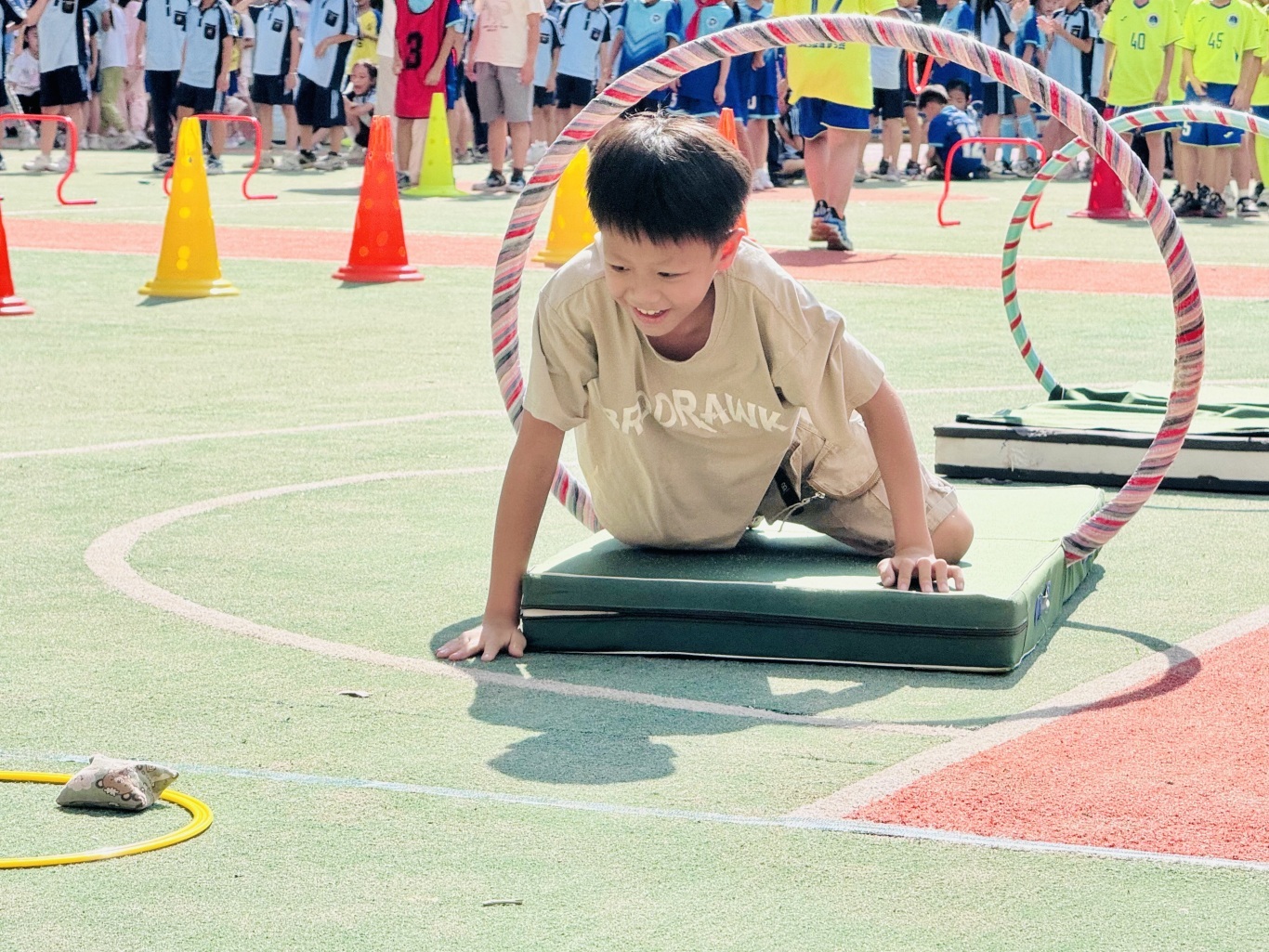 各年级竞赛项目红色意蕴浓厚。一、二年级“小卫士匍匐赛”模拟战地情境;三、四年级“突破封锁线”障碍接力重现奋斗历程;五、六年级负重行迎面接力彰显担当。师生协同参赛,现场氛围热烈,尽显拼搏风采。