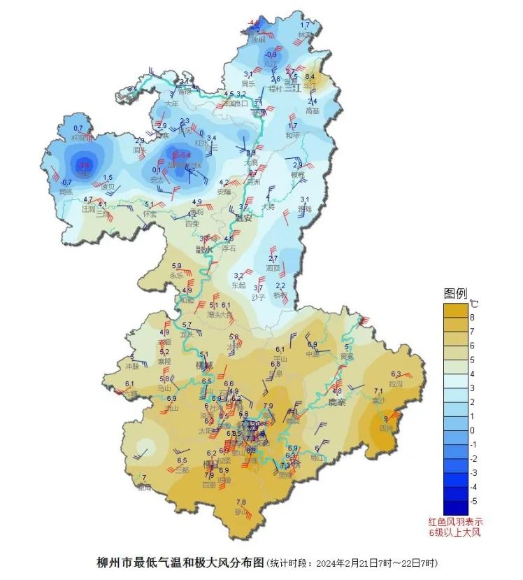 根据自动气象站资料统计,柳州市有29个乡镇最低气温0~4℃,10 个乡镇最低气温≤0℃,全市最低气温-5.4℃(融水安太蓝屏峰北侧,22日6:32)。中心城区和60个乡镇极大风≥6 级,其中2个乡镇极大风≥8 级,最大瞬时风速22.7 米/秒(鹿寨龙兴电站,东北风9级,22日0:14)。