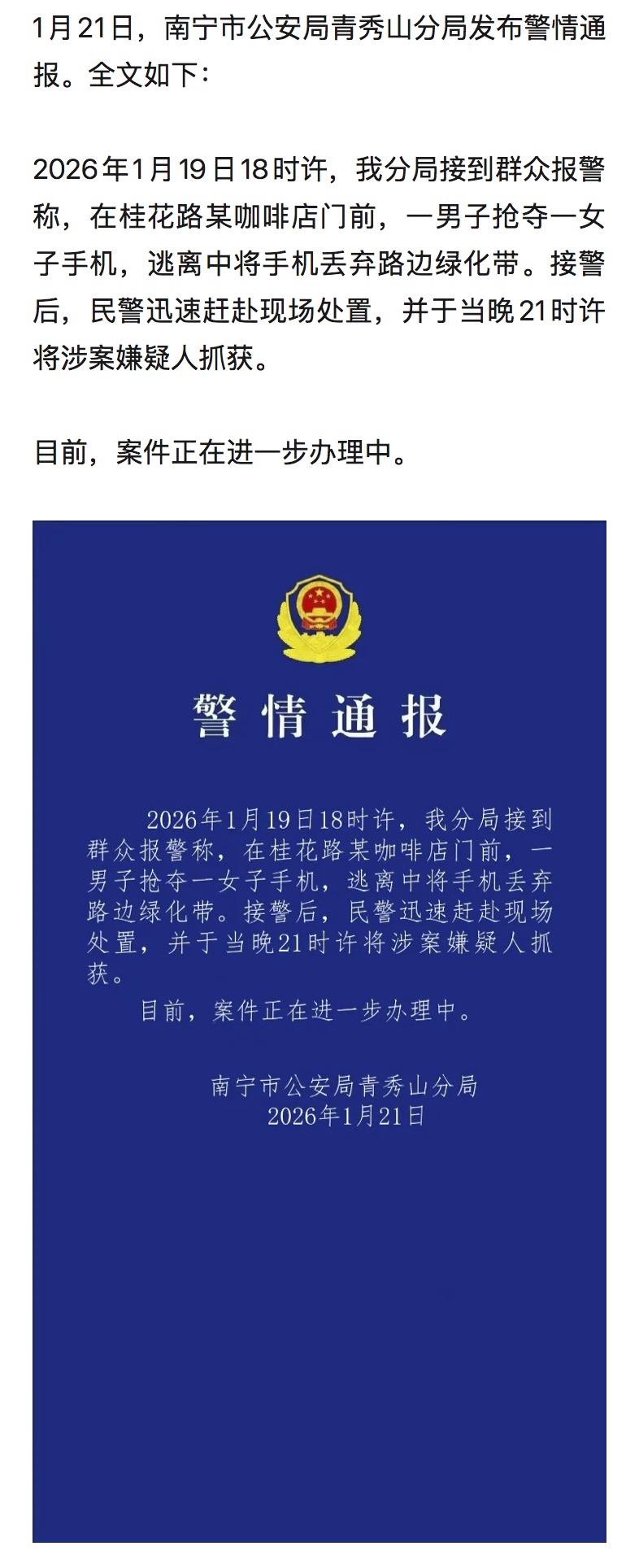 南宁一女子拍照时被陌生男子抢夺手机,警方通报