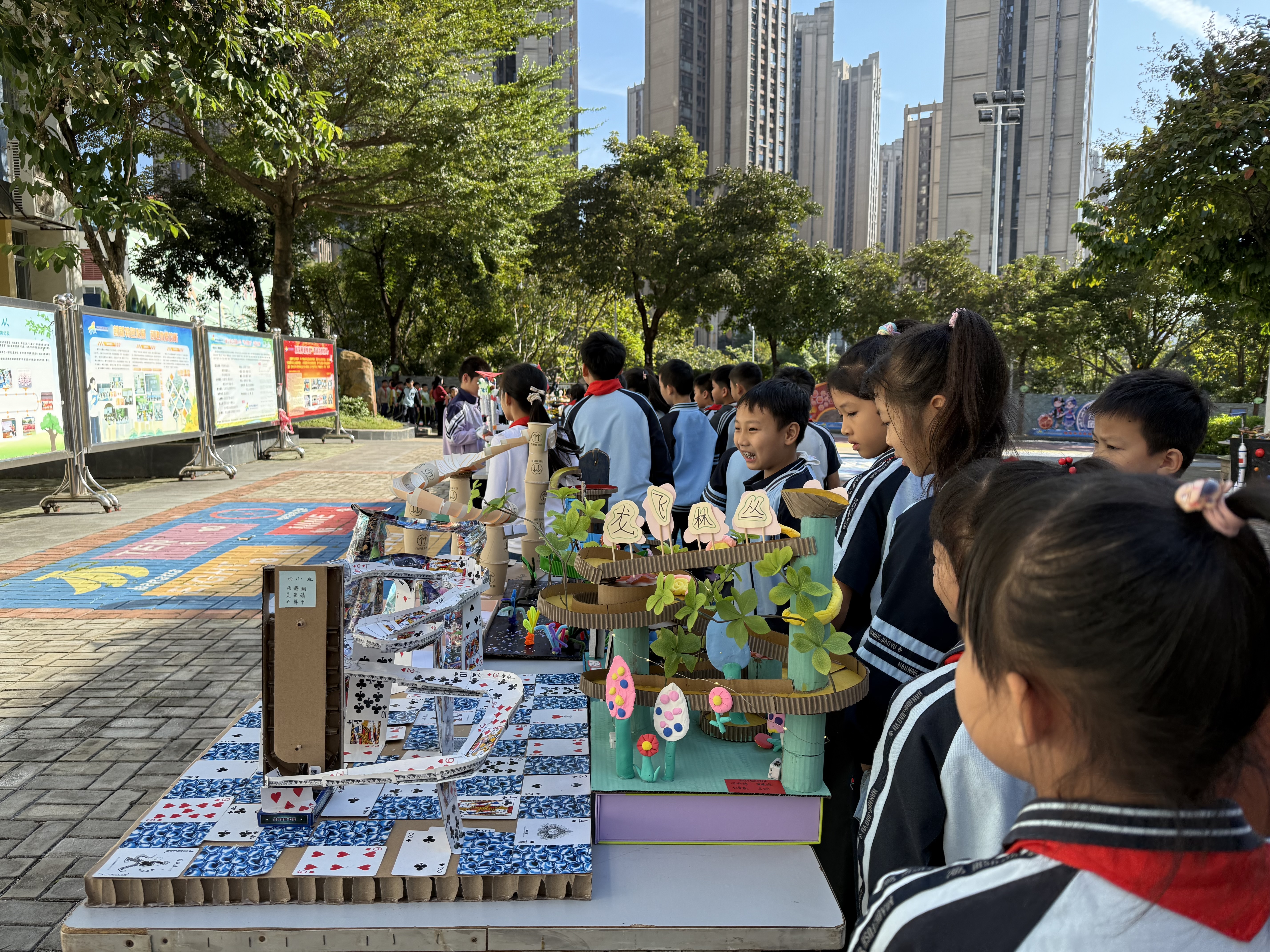 科技体验区宛如一个沉浸式的探索乐园。北斗科普讲座揭开了卫星导航系统的神秘面纱;威震天机甲稳步前行,彰显出人工智能的无限潜力;无人机编队腾空而起、灵活翻飞,恰似在蓝天中上演一场优美的芭蕾。展览区内汇聚了学生们的科技成果,堪称一场创新思维的视觉盛宴。手工搭建区独具匠心:动物模型栩栩如生,展现出生命的灵动韵律;过山车轨道蜿蜒曲折,演绎着物理法则;可再生能源发电装置巧妙实现能源转化,播撒下绿色发展的理念。科技小制作区陈列着自动浇花器、扫地机器人等实用发明,彰显出“生活即科学”的深刻理念;科幻画生动展现出AI智能为各行各业赋能的场景,在色彩交织间涌动着对未来的美好畅想;科技论文则以严谨的笔触剖析自然现象,展现出少年科学家的思辨才华。