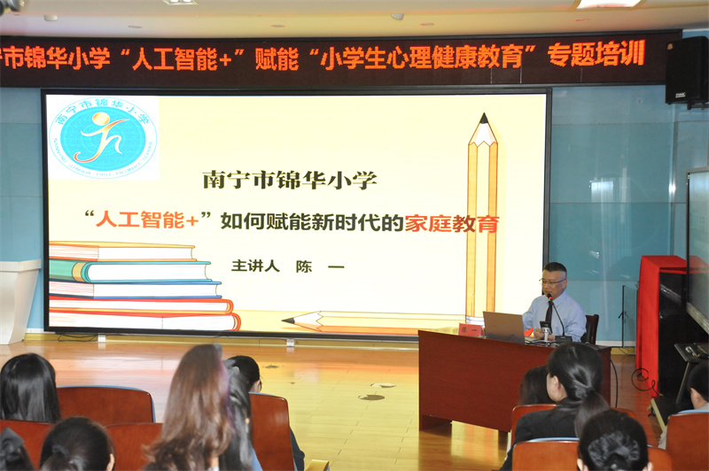 接着,学校特别邀请到广西首个“AI人工智能+”赋能心理咨询师、国家二级心理咨询师陈一老师亲临授课。作为本次家长会的核心亮点环节,专家讲座聚焦“人工智能+”赋能小学生心理健康教育,引发全场高度关注。陈老师深耕心理教育领域多年,出版个人专著九部,同时担任广西壮族自治区总工会职工心理公益专家,兼具深厚的理论积淀与丰富的实战经验,其独特的“AI+心理教育”融合实践备受行业认可。各班家长代表齐聚学校阶梯教室聆听讲座,各班家长在教室通过教室一体机观看现场直播。