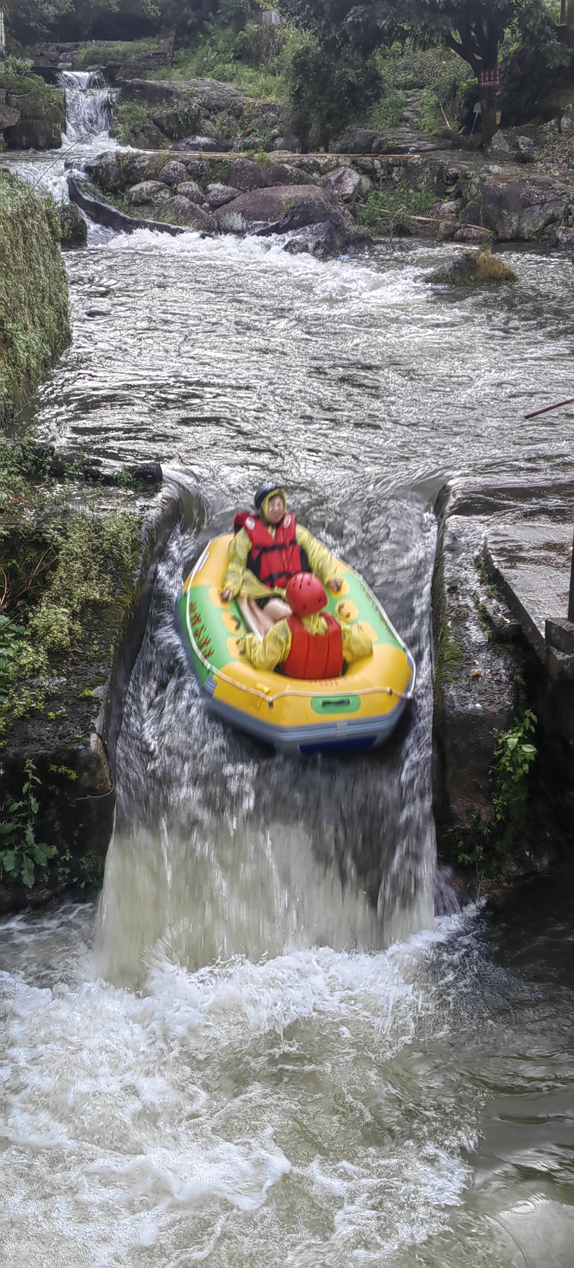 担心假期人多,同行的老杨早早就订好了这里的民宿,办理入住时顺顺利利。从景区接待大厅到民宿区,要走百米石板路,路边大树枝桠上、民宿走廊栏杆上、围墙砖缝里,都挂着一串串彩灯,风一吹就轻轻晃,像撒了满地星星,夜晚灯一亮,整个景区如同在梦幻之中。民宿房前有条河谷,景区漂流就在这儿,看到几个游客正在漂流,我心痒痒的,可惜我们来晚了。小夏打趣说 “下次早点来,体会一下漂流的刺激”。放下行李,我提议去传说中的无边界泳池游泳,连换衣服都透着股急劲儿,同行的两位河南老人笑着说:“跟着你们年轻人,咱也沾沾活力!”