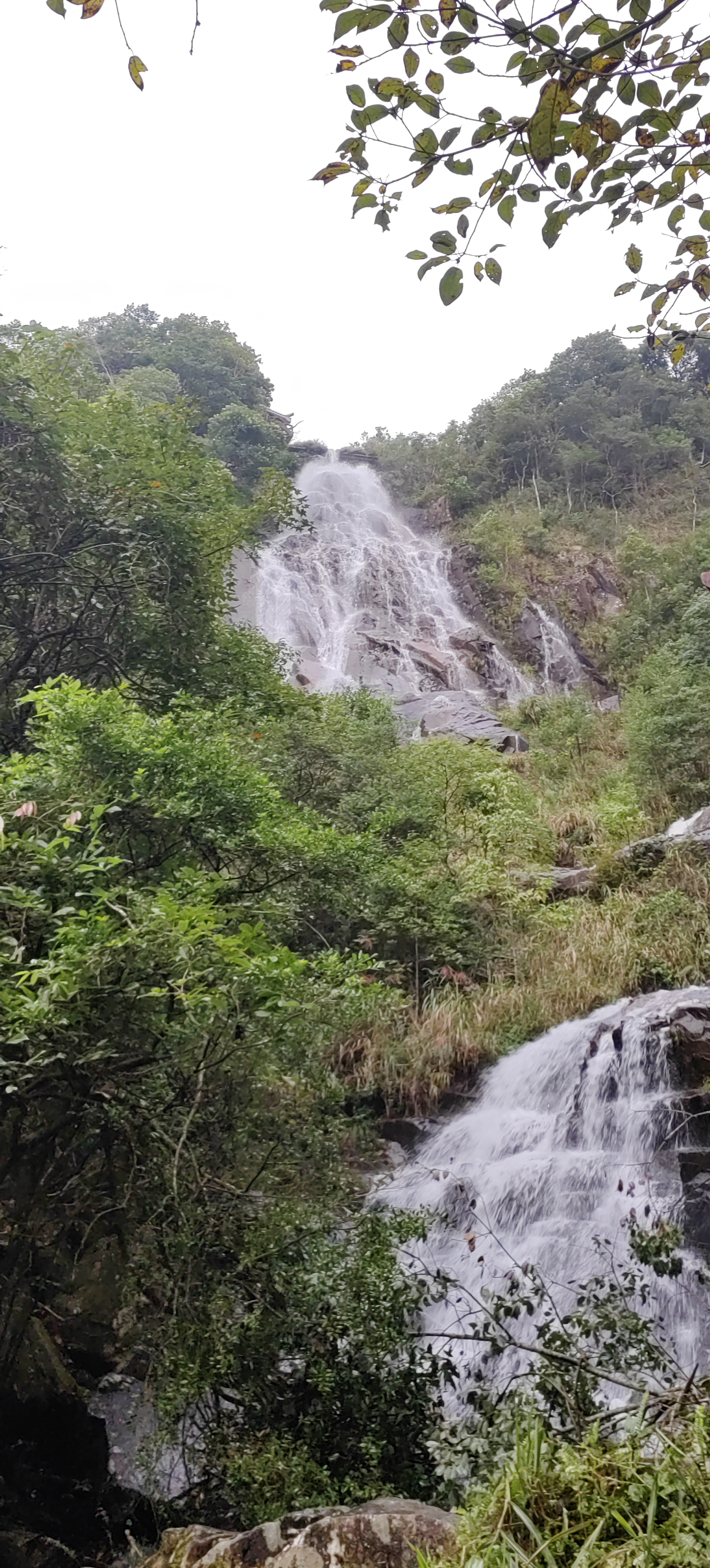 想着瀑布就在前面,老杨、小高夫妇扶着两位人,顺着平缓的石阶往下走,但台阶越走越陡峭,只好让老人原地等我们返回。再往下走不久,听见了 “轰隆隆” 的水声,像有谁在远处敲鼓。再往下拐个弯,莲花瀑布突然撞进眼里 —— 九级水流从绝壁上垂下来,像仙女甩下来的白绸带,最上面的水流细得像纱,落到中间就变宽,砸在岩石上溅起满屏水花,雾气裹着风扑过来,凉丝丝地贴在脸上。站在仰瀑亭里,能看见水珠顺着亭檐往下滴,连呼吸都带着股甜意,刚才下山的累、石阶的陡,早被这壮观冲得没影了。我们举着手机拍照、录视频,不停感叹 “太值了!”后来才知道,这瀑布总落差有 520 米,是 “桂东南第一瀑”,要是雨季来,水流更猛,光想想就觉得震撼。