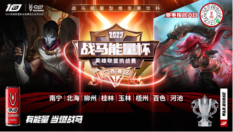 高燃激情的战马能量杯怎少得了热情的广西,2023年战马能量杯英雄联盟挑战赛在广西也设立了多个赛点,作为广西人,“桂”在参与,在激情的比赛中展现“桂”人精神。以热血铸就此志,剑指那巅峰的荣耀,前进吧,英勇无畏的召唤师们!