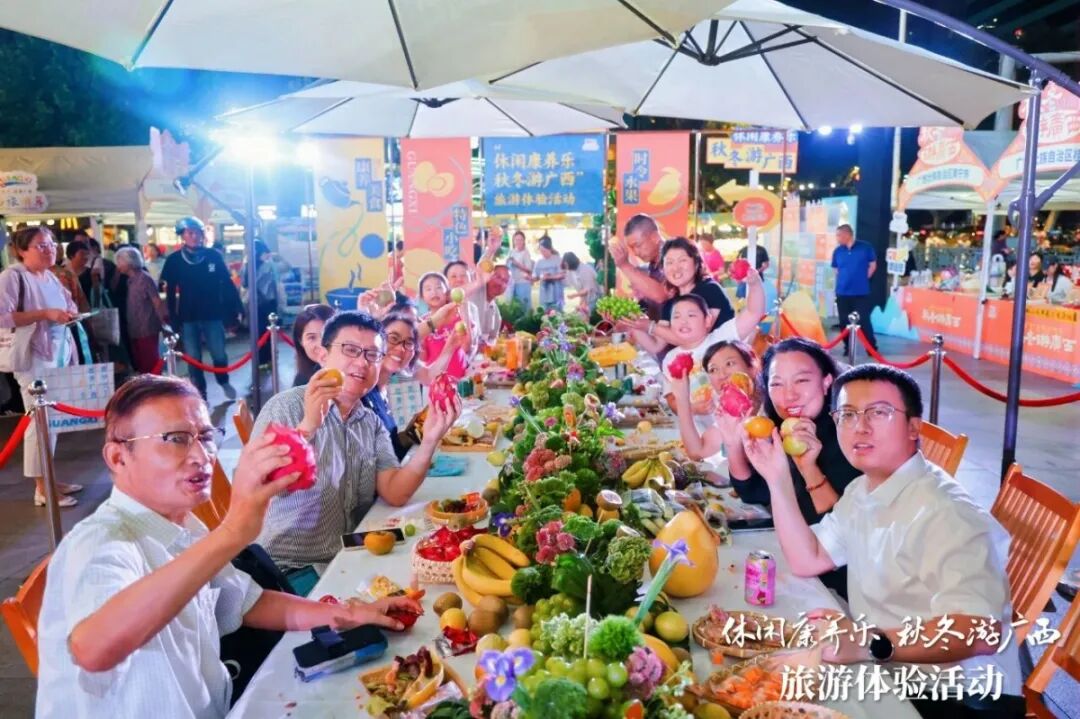 活动期间同步开展旅游体验活动,现场精心打造特色主题展位,设置水果美食长桌宴、民俗竹竿舞表演、非遗技艺展示及特色文艺演出等项目,通过味觉、视觉、听觉的多重体验,让市民游客沉浸式感受广西魅力。