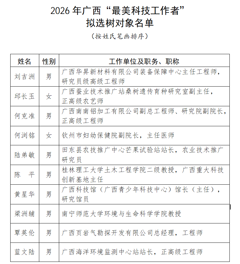 根据《自治区党委宣传部、自治区科协等六部门关于开展2026年广西“最美科技工作者”选树宣传活动的通知》(桂科协组发〔2026〕1号)精神,我区通过各种渠道,在全区范围内组织开展了推荐遴选工作。经组织开展综合评议,确定了刘吉洲等10名科技工作者作为选树对象。