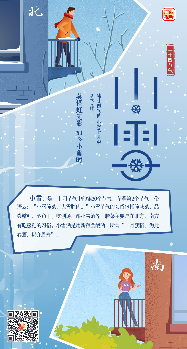 小雪,是二十四节气中的第20个节气,冬季第2个节气。俗语云:“小雪腌菜,大雪腌肉。”小雪节气的习俗包括腌咸菜、品尝糍粑、晒鱼干、吃刨汤、酿小雪酒等。腌菜主要是在北方,南方有吃糍粑的习俗。小雪酒是用新粮食酿酒,所谓“十月获稻,为此春酒,以介眉寿”。