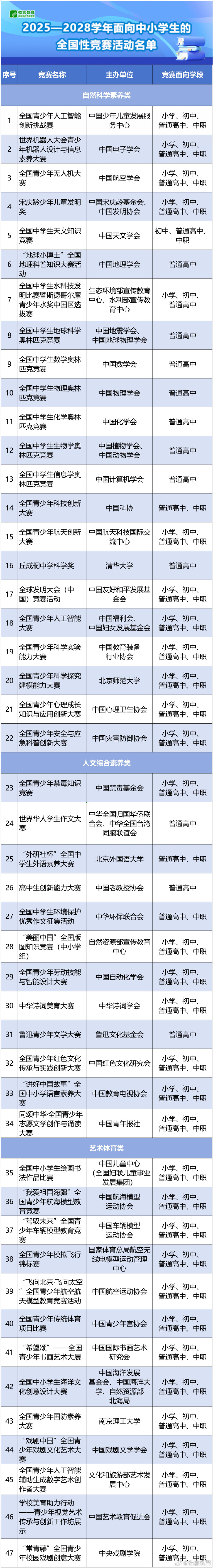 近日,教育部印发通知,确定47项竞赛活动为2025—2028学年面向中小学生的全国性竞赛活动。通知明确,2025—2028学年面向中小学生的全国性竞赛活动,举办时间原则上为2025年10月至2028年8月,在此期间每学年举办不得超过1次,累计不超过3次。竞赛以及竞赛产生的结果不得作为中小学招生入学的依据和高考加分项目,不得在高校招生中违规使用竞赛结果。