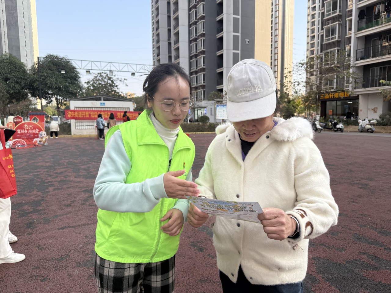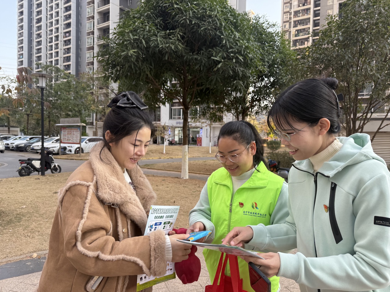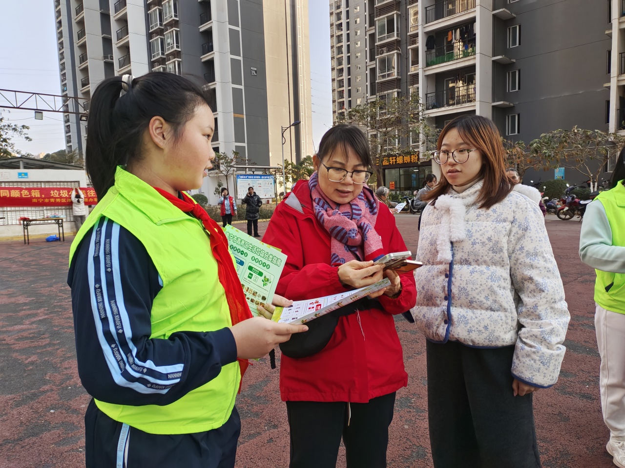 这边劳动热火朝天,那边宣传推广组的师生们也忙碌着。他们穿梭在小区里,通过发放垃圾分类宣传册等方式,热情讲解垃圾分类知识,向居民宣传垃圾分类的重要性,引导社区居民做好垃圾分类,让“绿色、低碳、环保” 的理念深入人心。