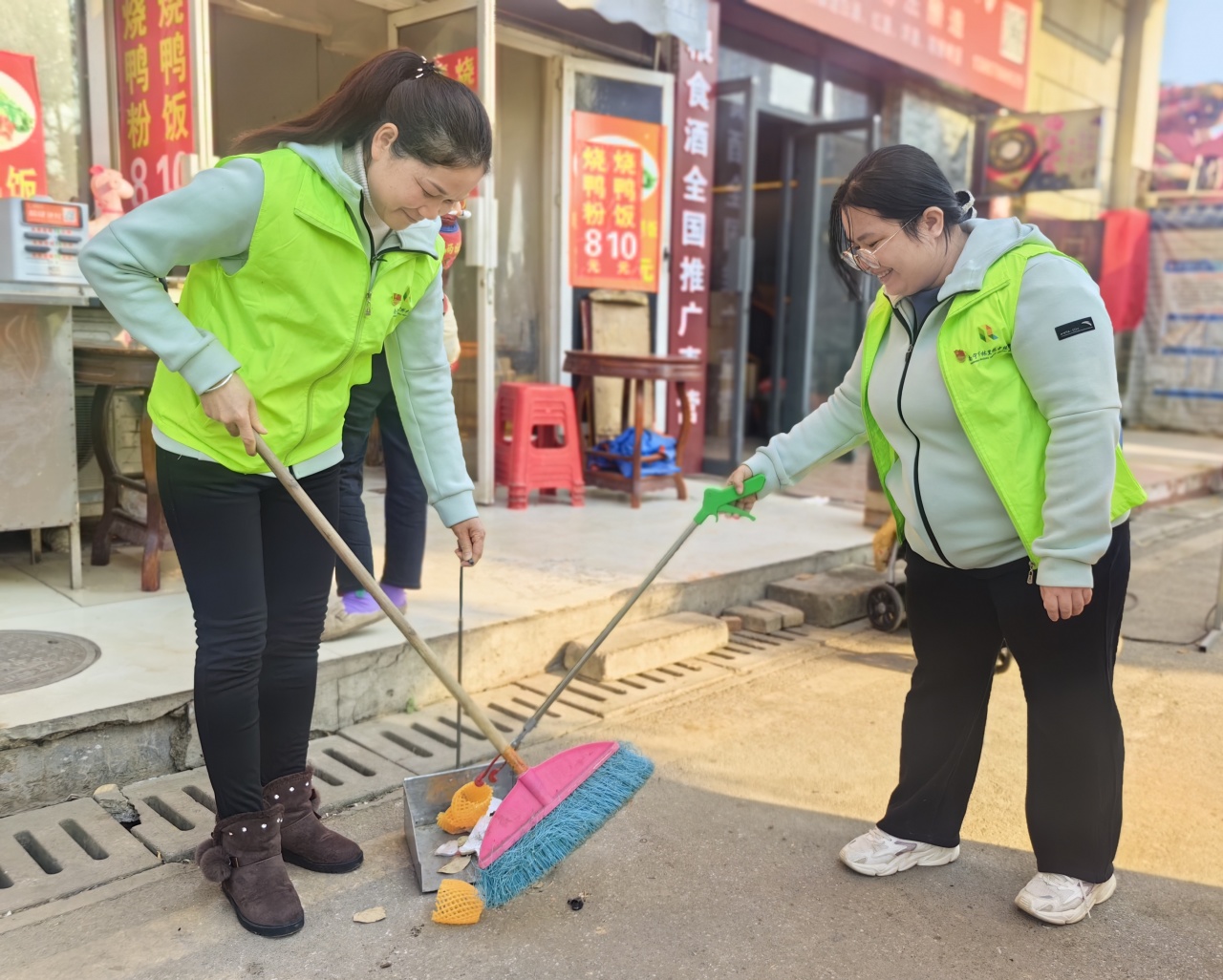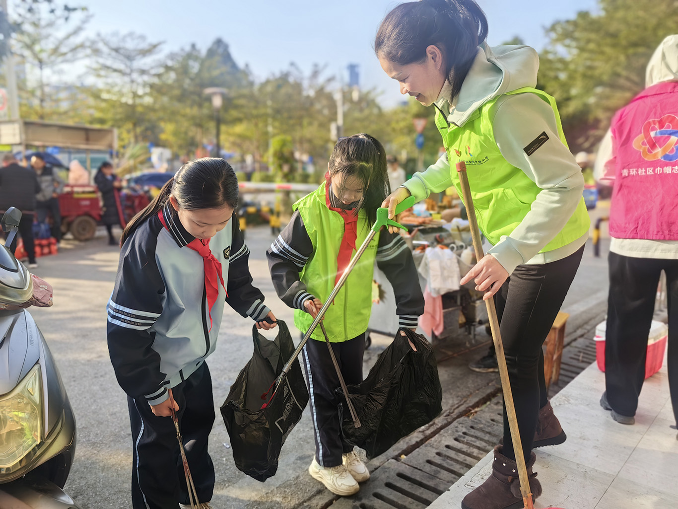 活动中,林里师生与青环社区、林里桥家园小区物业的工作人员一起分成两组,大家各司其职,参与生活垃圾分类实践活动。垃圾清洁组的组员们,利用扫把、垃圾铲、钳子等清洁工具,对林里桥家园小区、附近商铺路面、绿化带及下水道盖子周边进行细致清理。他们认真地将白色垃圾、烟头等一一捡起,不放过任何一个角落,以实际行动为小区环境整洁出一份力。