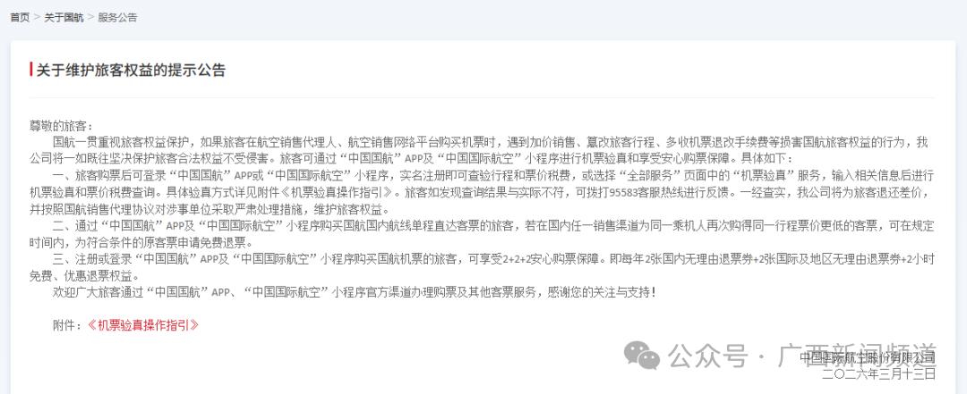 一、旅客购票后可登录“中国国航”APP或“中国国际航空”小程序,实名注册即可查验行程和票价税费,或选择“全部服务”页面中的“机票验真”服务,输入相关信息后进行机票验真和票价税费查询。具体验真方式详见附件《机票验真操作指引》。旅客如发现查询结果与实际不符,可拨打95583客服热线进行反馈。一经查实,我公司将为旅客退还差价,并按照国航销售代理协议对涉事单位采取严肃处理措施,维护旅客权益。