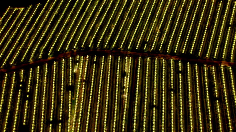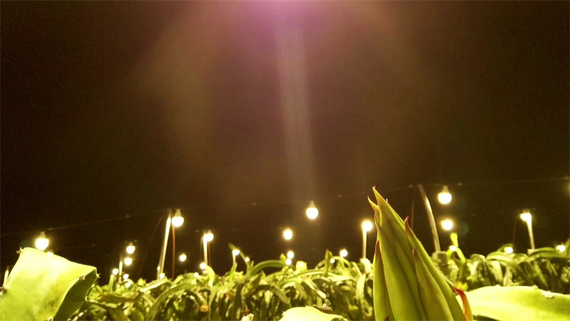 在归义镇安安火龙果种植基地,只见一行行火龙果植株上面悬挂起了LED灯,灯泡在夜幕中泛着温馨的光,全园望去如繁星闪闪,让人叹为观止。