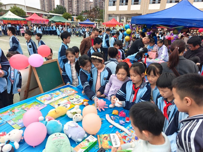活动现场热闹非凡,各班精心布置义卖摊位,特色横幅、创意海报装点其间,尽显巧思。摊位上整齐排列书籍、手工作品、毛绒玩具、书画作品等爱心好物琳琅满目,吸引着同学们驻足挑选。小摊主们分工明确、各司其职,推销员热情介绍,收银员认真记账,彼此默契协作。党员教师也化身爱心摊主,与学生一同参与义卖,为活动增添了温暖底色。现场的 “爱心盲盒”“套圈游戏” 等创意互动项目更是人气爆棚,大家积极参与,用行动为爱心助力。