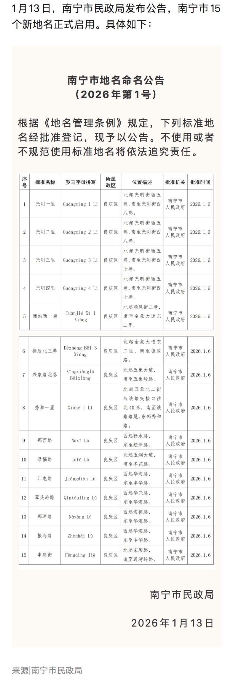 南宁市15个新地名正式启用