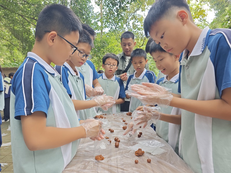 在研学过程中,同学们还学习了“拍八虚”时辰养生法的操作要点与经络原理。同学们还积极参与实践活动。在林间捡拾榛子、松果、板栗,感受大自然的馈赠。在中药加工区,同学们观看了中药打粉、配药的过程,对中药的制作工艺有了更直观的认识。最让同学们感兴趣的是古法纯手工制丸的体验环节。在师傅的指导下,同学们亲手操作蜂蜜炼蜜、团块揉搓等工序,将药粉制成药丸。一位同学表示:“亲手制作药丸让我感受到了中医药文化的传承不仅仅是一种知识的传递,更是一种技艺的传承,我为自己能够参与其中而感到自豪。”
