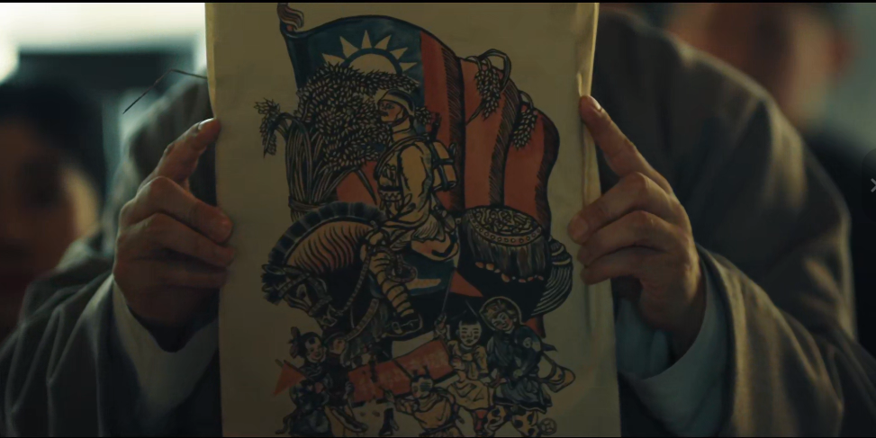 纸上是一幅门神大小的木版年画——门神不再,取而代之的是持枪百姓和戴钢盔的战士。