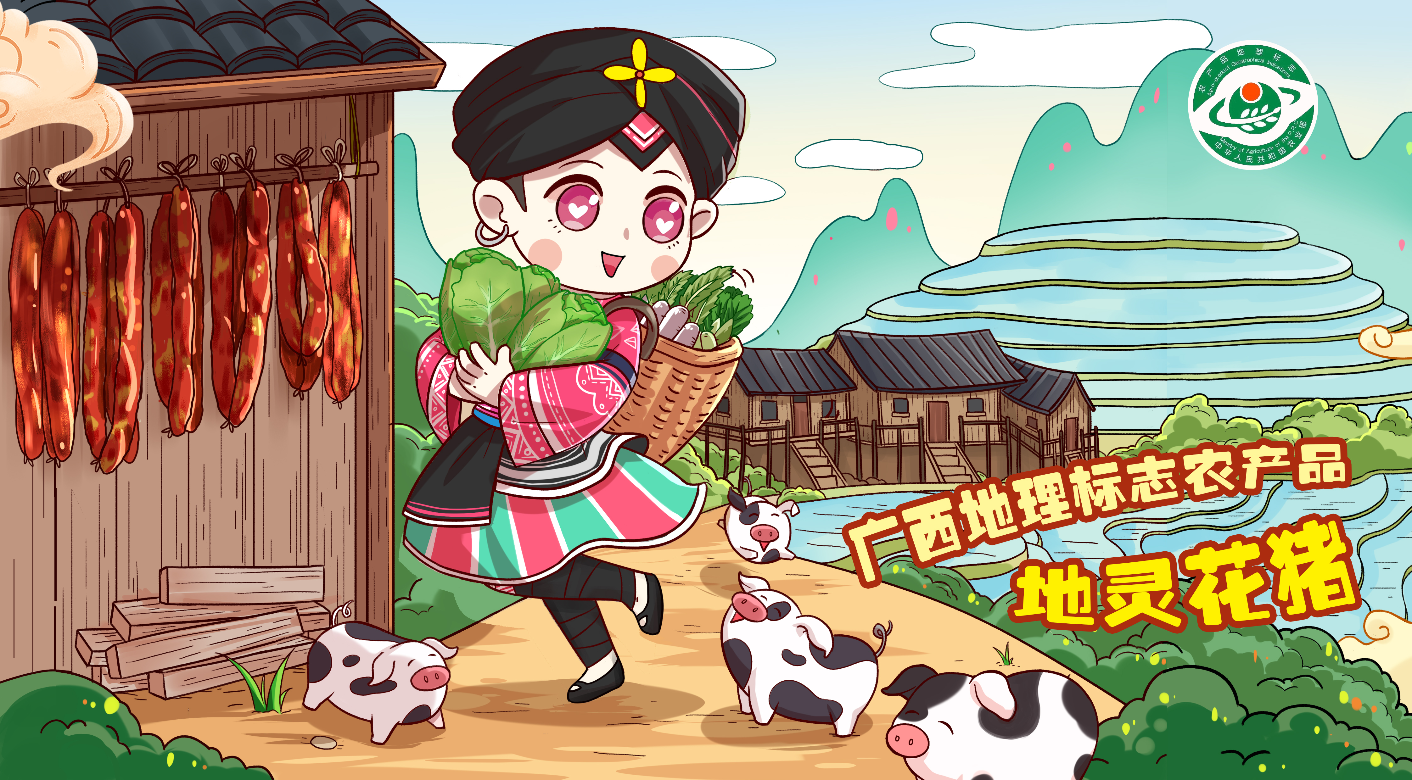 桂北山区的清晨,阳光洒在梯田上,山清水秀景色迷人。一个红瑶族女孩起早,背着一背篓的蔬菜去喂花猪。花猪欢快着跑过来抢食。女孩家的屋檐下,晾晒着许多花猪腊肉,一副祥和的画面。女孩一家人在养殖花猪的产业上,日子越来来越红火。