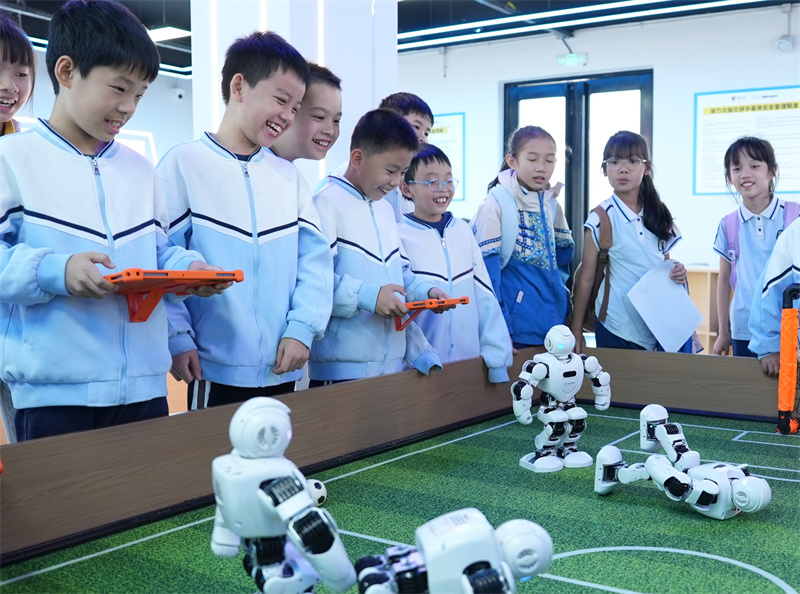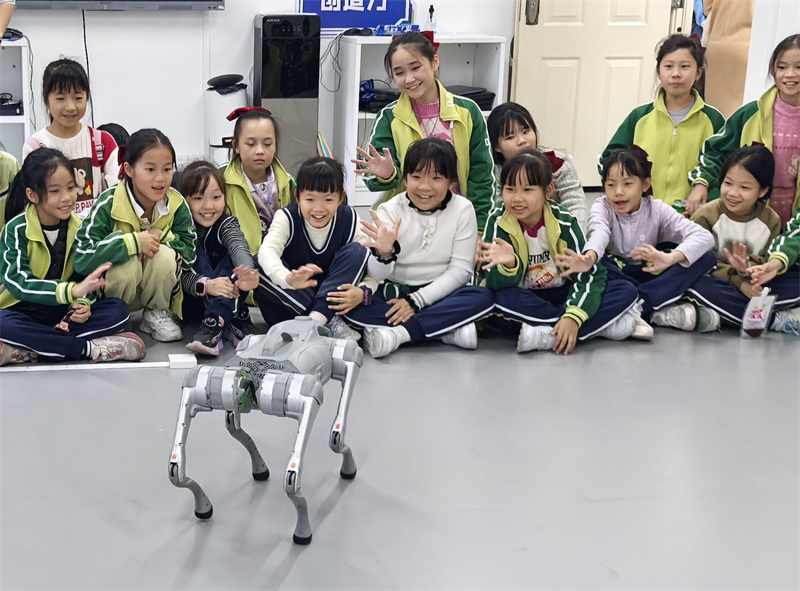 在充满未来感的“人工智能体验馆”,一至三年级孩子们开启了他们的科技启蒙第一课。“太神奇了!我让它转圈它就转圈!”二年级学生小韦兴奋地喊道,他刚刚通过简单的操作,成功指挥智能机器狗完成了一系列指令。学生们还与机器人互动,体验AI图画制作,孩子们在欢声笑语中,完成了与人工智能的第一次亲密接触。这些精心设计的综合实践活动,将抽象的科技概念化为可触可感的游戏,在幼小的心灵中悄然播下好奇与探索的种子。四年级的学生也在此处场馆研学导师的指导下完成了研学的课程。