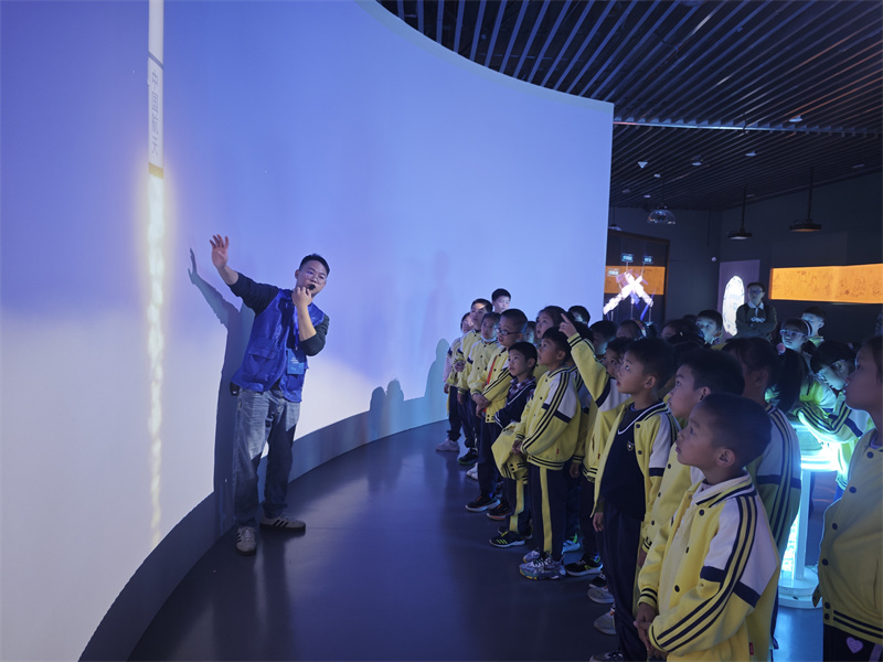 广西区博物馆的“光影体验阅读馆”中。同学们仿佛踏上了一场穿越时空的航天之旅。“我感觉自己真的站在发射指挥中心,看着火箭点火升空!”在“天际遨游”沉浸式体验区,四年级学生小王激动地分享着他的感受。从“古人慕天”的神话传说到“铜鼓飞天”的文化创意,再到现代“中国空间站”的宏伟壮丽,同学们通过全息动画、AR互动等先进技术,亲身触摸中国航天事业的脉搏,民族自豪感与探索未知的渴望在心中激荡。