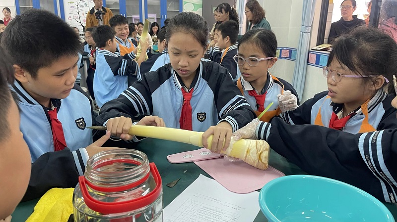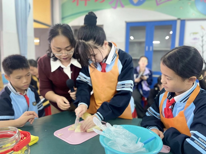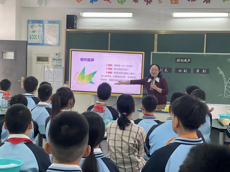 酸笋腌制实践课,是把广西地域特色美食的制作技艺,变成学生们能亲手体验的劳动课,让竹文化从课本里“走”出来。课堂上,老师先仔细讲解如何挑选、处理新鲜竹笋,社区里有经验的阿姨手把手教大家腌制酸笋的窍门。学生们围在一起,剥笋壳、洗笋块、切条,最后小心翼翼地封坛,从一开始的笨手笨脚,到后来越来越熟练,每一步都做得格外认真。