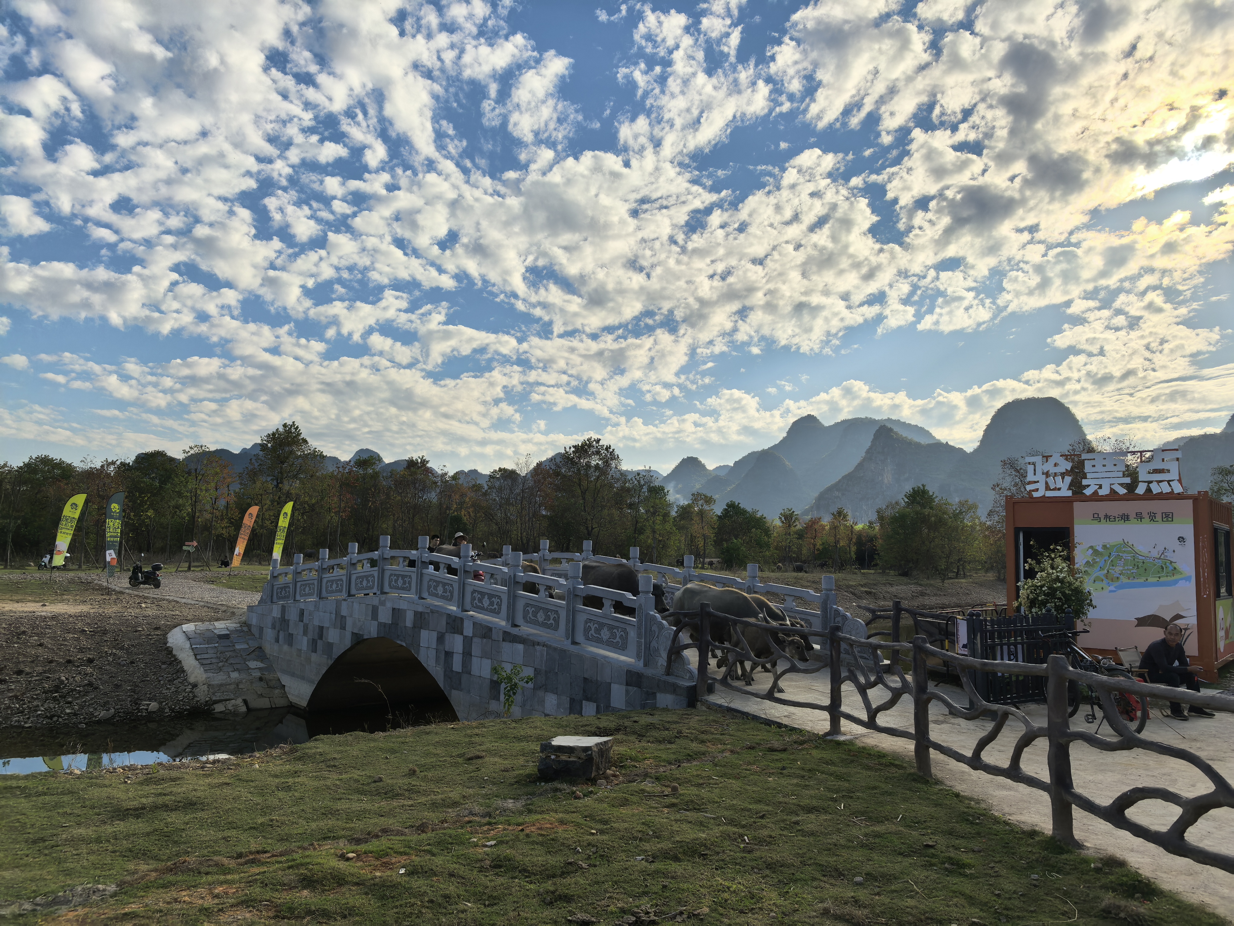 日头往峰林后沉时,我们回到入口的拱门处合影。天边的云染了橙黄,“探索乌桕滩”的字牌裹在暖光里,夫人的红毛衣与朋友的蓝外套衬着身后的山水树影,连风都柔得不肯惊动这帧画面。低头看手机里的照片,每一张都裹着这天的色彩:溪涧里的红黄倒影、江面上的红绿相映、叶隙间漏下的暖光,连牛蹄掀起的涟漪里,都裹着半片叶的红、半片叶的黄。