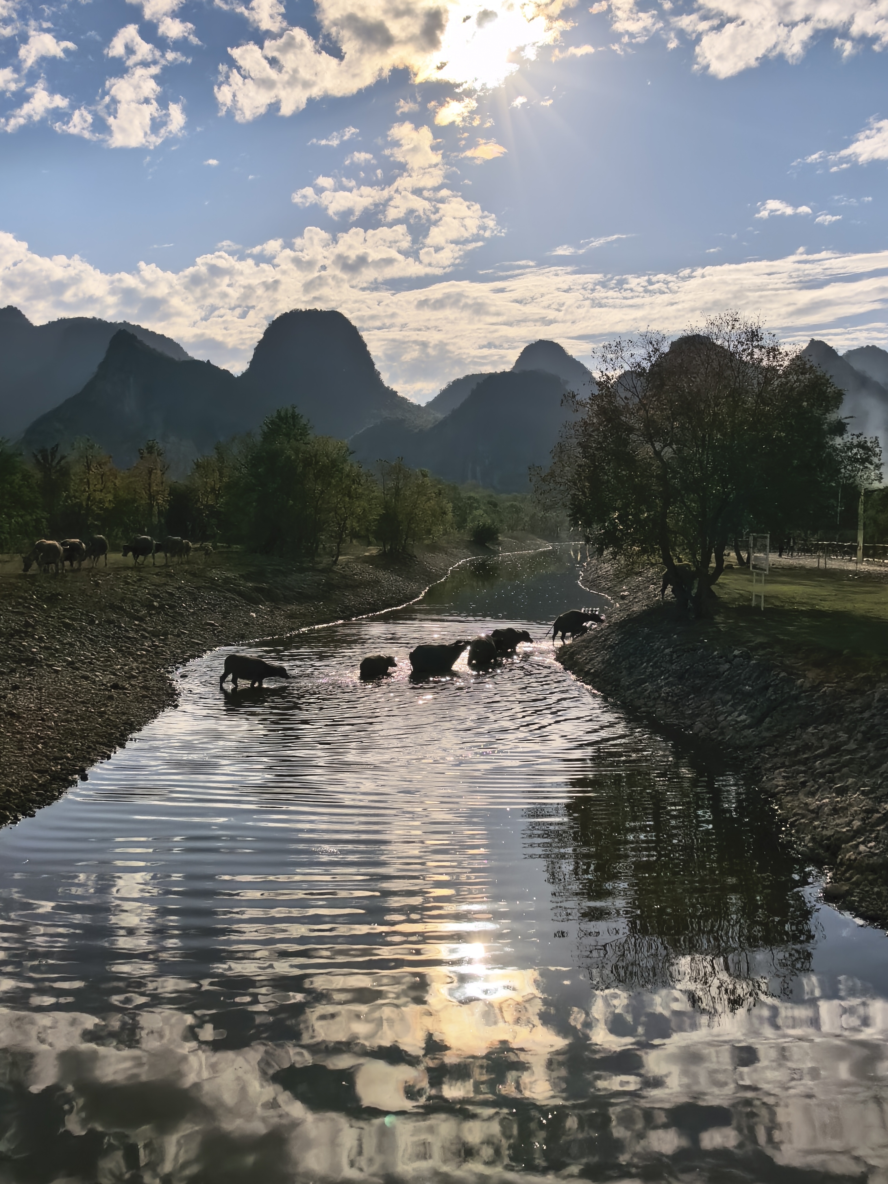 刚踏入滩涂,就撞见一场“牛群的归程”。一群水牛从林子里踱出来,踩着碎光往村子去,队伍慢悠悠扯成一道线。它们踱到溪涧边时,天的蓝、云的白恰好沉在水里,乌桕叶的红与黄泼在水面,牛群的影子便浸在这五彩斑斓里,连蹄子掀起的涟漪都晃着碎星。夫人举着手机笑:“这哪是放牛,是老天爷在画里赶牲口。”我攥着新手机的手也热起来,镜头里,喀斯特峰林的青黛作底,漓江水的碧绿为带,乌桕树的红黄为缀,牛群的墨色点睛,像把整个桂林秋冬的精髓,都揉进了一帧里。