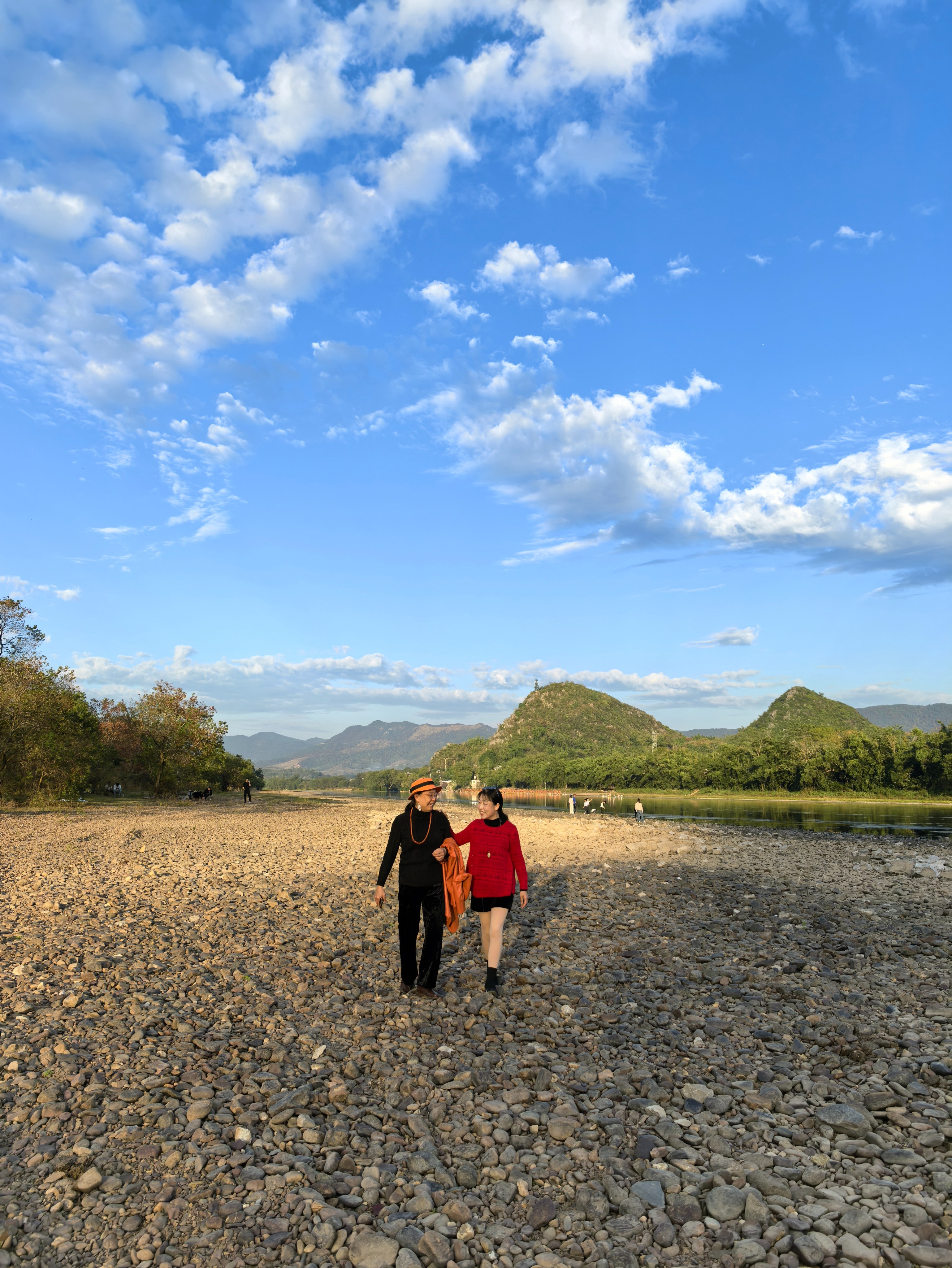 再往里面走,漓江忽然铺展得更宽,把两岸的乌桕林、远处的峰林都揽进怀里。天的云像攒足了劲美:成团的棉絮浮在高处,丝缕的轻烟缠在峰尖,全被漓江妥帖接住。水是软的,把天的蓝揉得更润,把云的白浸得更透,而岸边的乌桕树,正将红黄相间的枝叶探向水面,像是在与江水低语,枝叶的倒影浸在碧波里,红的更艳、黄的更亮,与远处青灰色的峰林相映成趣,构成一幅绝美的秋冬山水画卷。夫人与朋友蹲在浅滩边,忽然掬起一捧水往空中扬——水珠撞在阳光里,竟碎出一道细巧的彩虹,晃得人眼睛发颤。我举着手机按快门的手都在抖,只觉得这光景太像梦:冷冬的风裹着暖,漓江水酿着晴,乌桕叶燃着色,连偶然扬起的水珠都肯赐一场惊喜,这便是桂林秋冬独有的韵味,不似春日的娇嫩,不似夏日的浓烈,却有着沉淀后的厚重与绚烂。