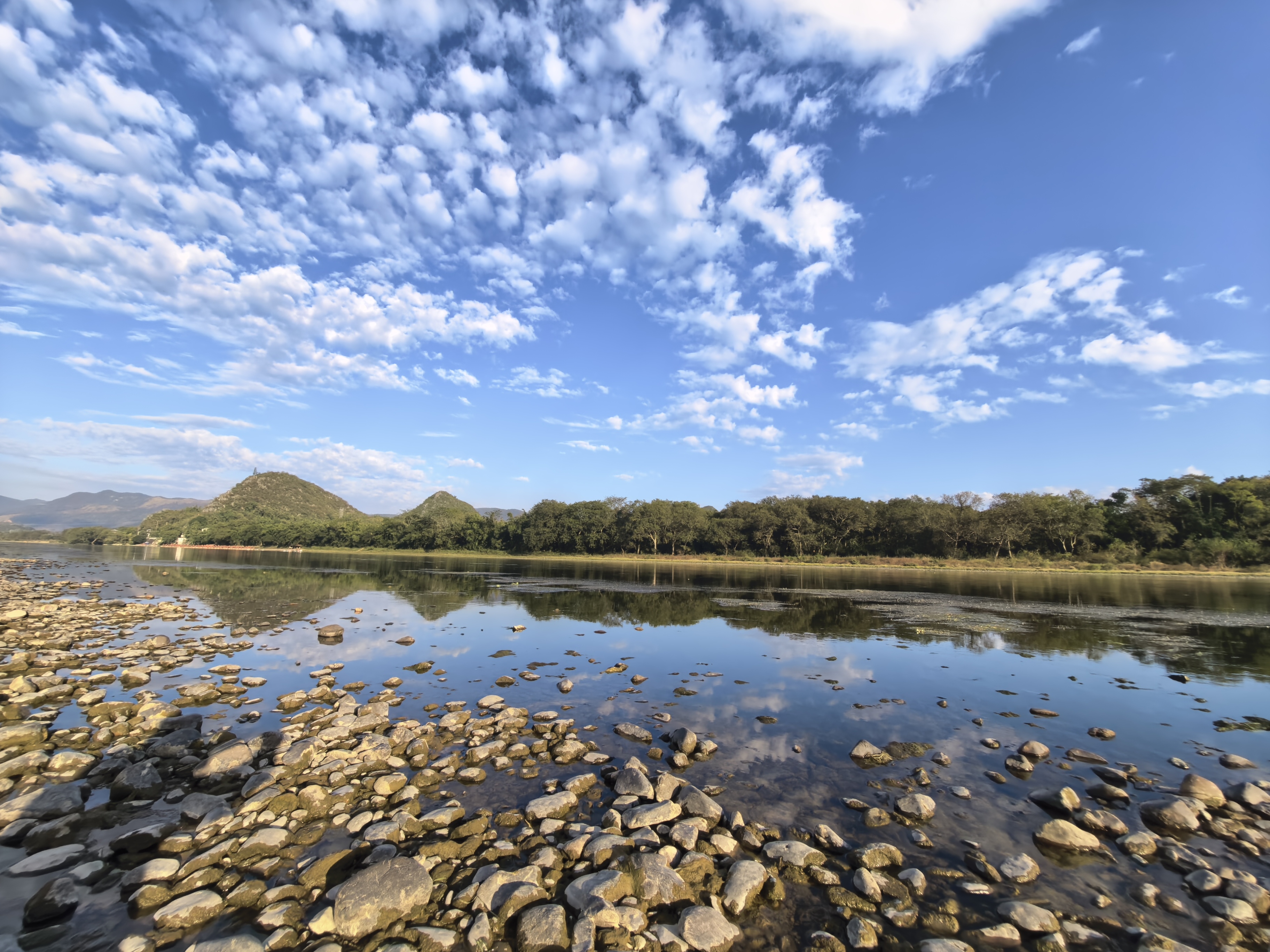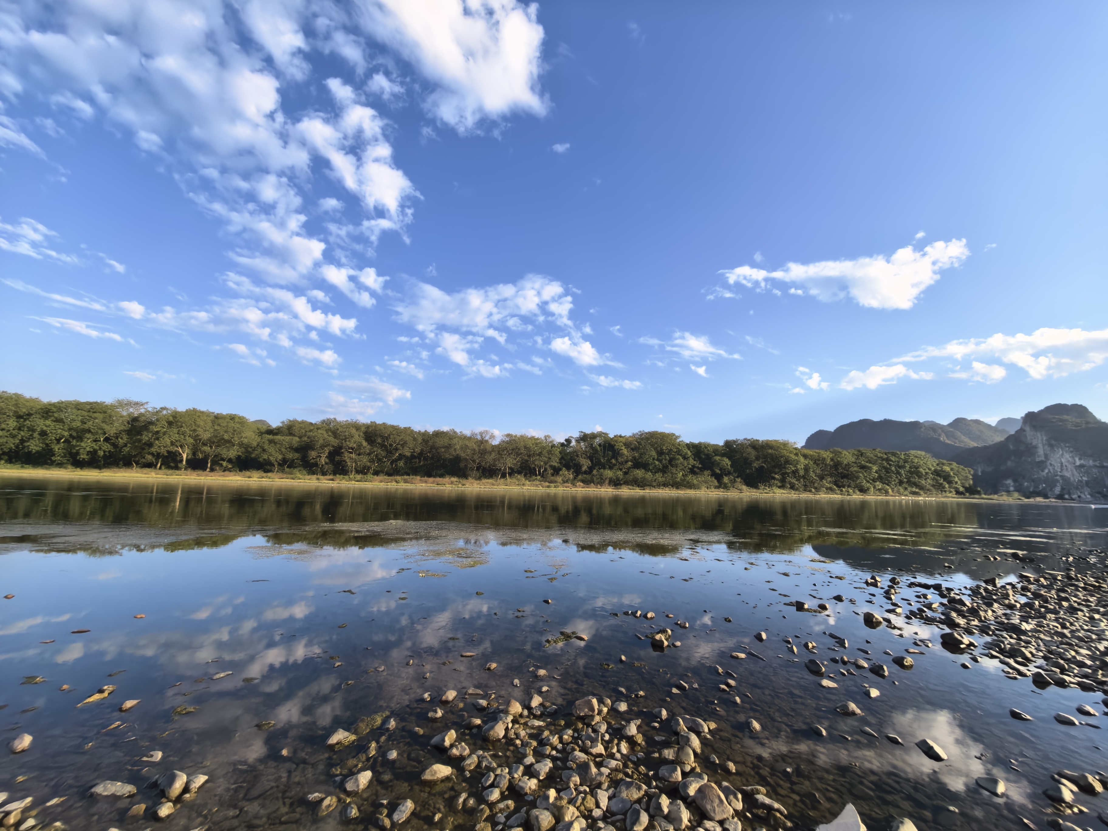下午四点的光正软,把远处喀斯特峰林晕成淡墨色的剪影,而滩上的乌桕树,恰是这剪影前最浓艳的着色。抬头时先被天惊住:云是碎碎的絮,白得发绒,嵌在泼开的靛蓝里,风一吹便漫成丝缕,落进漓江时,水便成了透亮的镜。凑到江边细看,鹅卵石在水底铺成浅灰的纹,云的碎影、峰的淡影、树的红影黄影,全浸在这一汪清绿里,红的热烈、黄的温润、绿的澄澈、灰的沉静,连阳光落下来,都在波心晃成碎金,把山水树影揉成一幅流动的画。