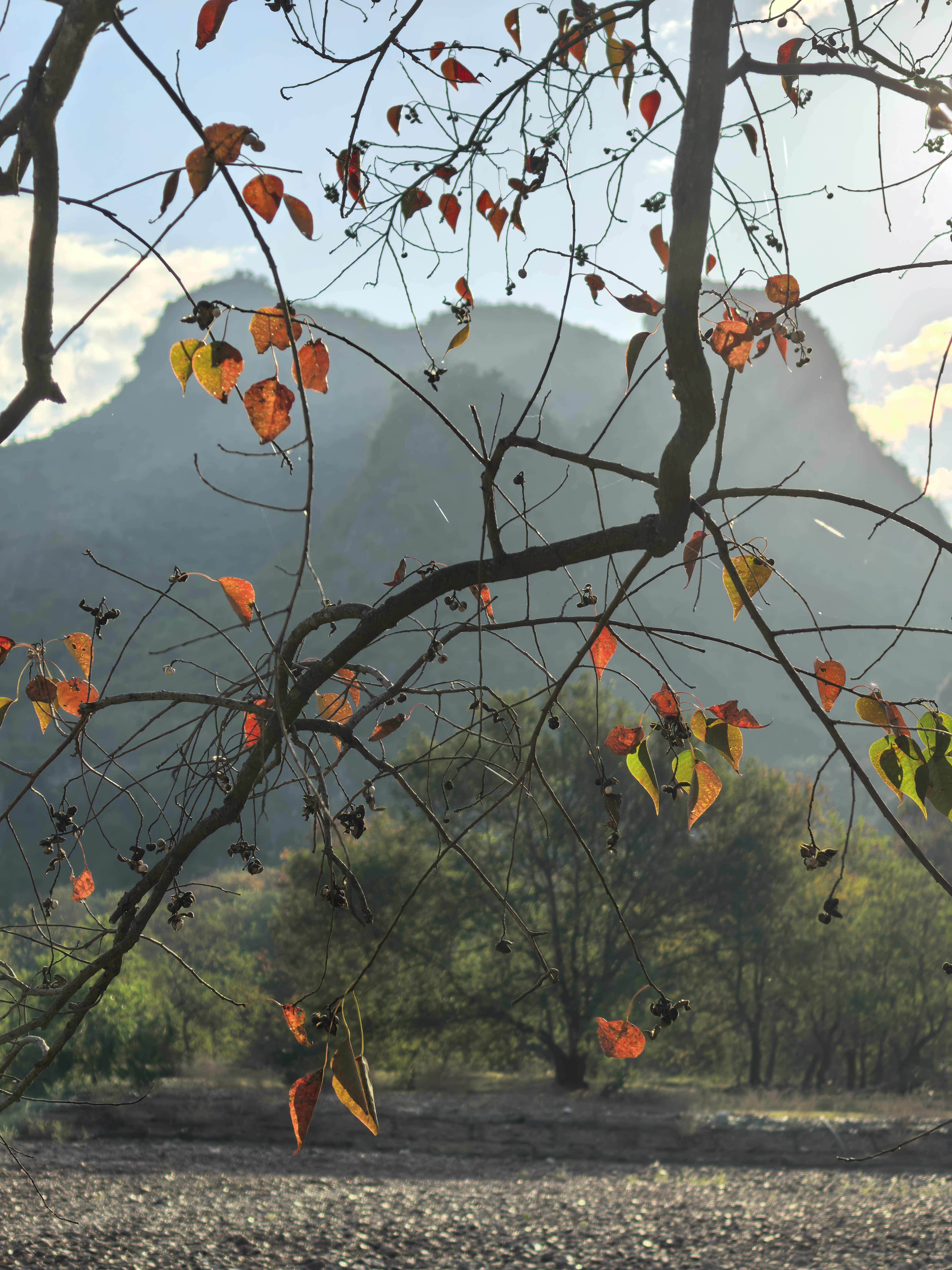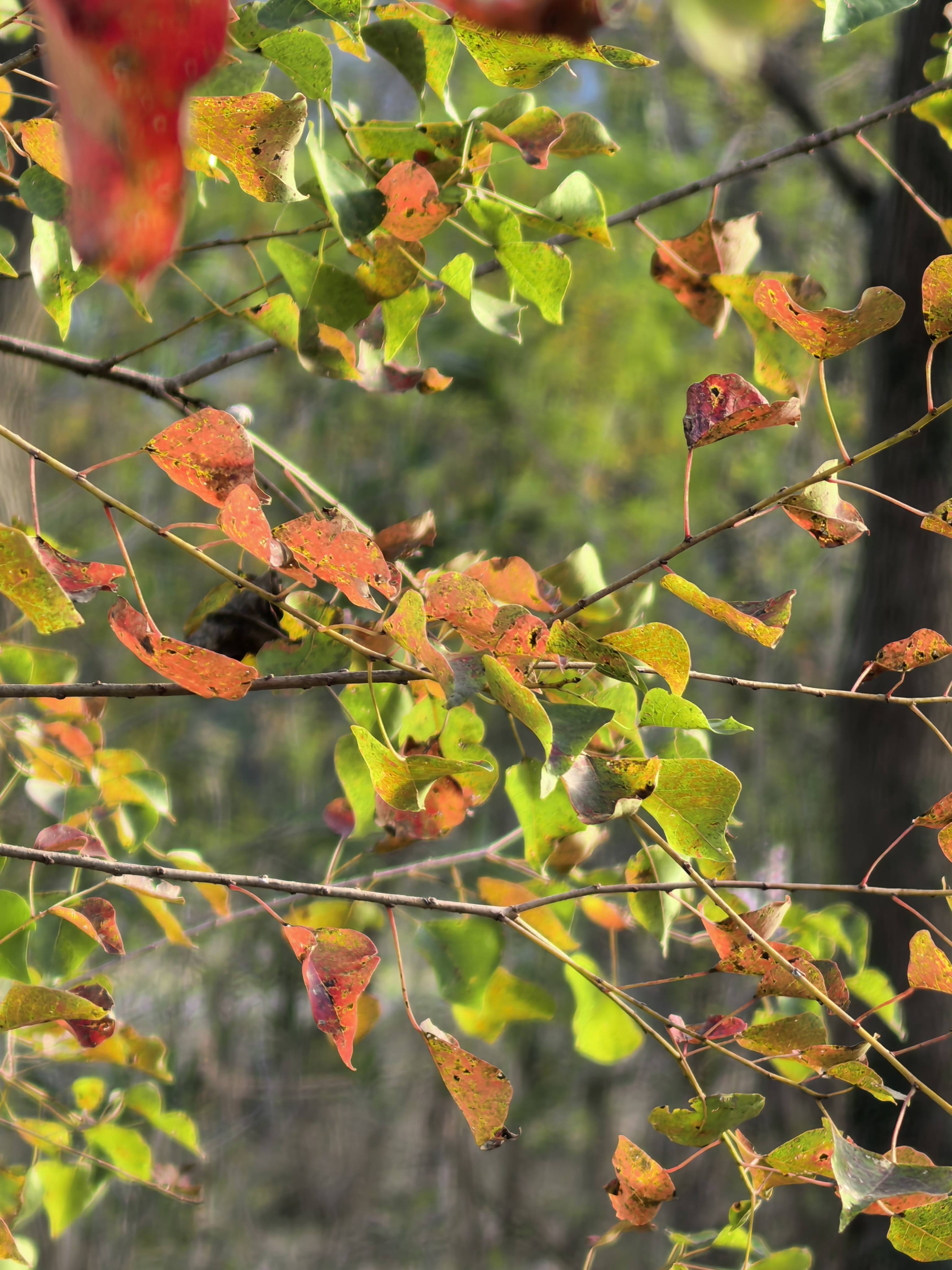 坐观光车往滩心去,石路颠得人有点晃,眼却舍不得挪开。逆光里的乌桕叶最是惊艳,阳光从叶隙扎进来,把红色滤得透亮,像枝桠上燃着细碎的火;黄色的叶片则泛着暖光,像缀满了星星点点的金箔。我们三番五次跳下车,踩着鹅卵石往林深处钻——新补的树苗叶色更嫩,红得娇俏、黄得明媚;老树枝桠更遒劲,红得深沉、黄得厚重,青绿色的残叶点缀其间,三色在风里轻轻碰撞,碎叶落在肩头,像秋递来的、写满诗意的小笺。