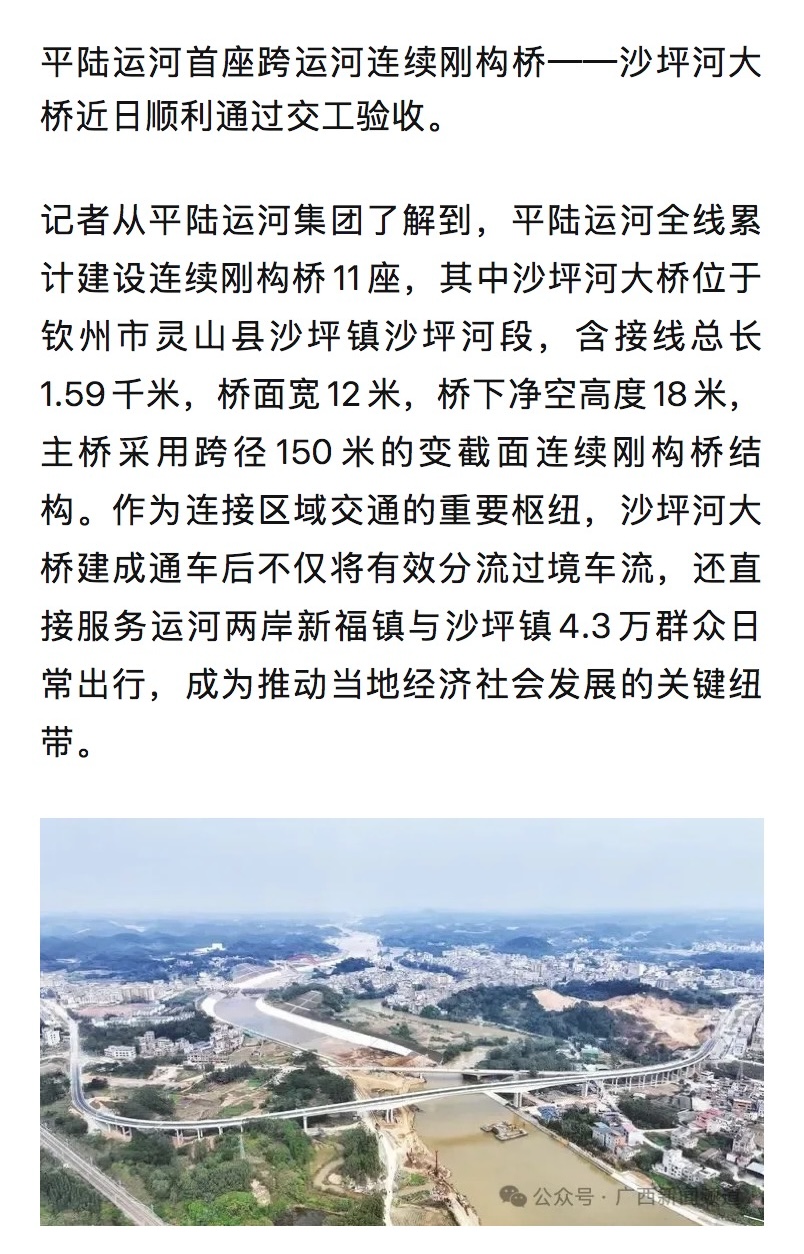 此次验收内容包括桥梁主体结构、路基工程、路面工程、交通安全设施、绿化工程、机电工程等多个分项工程。验收小组通过现场实地查看、听取相关单位汇报查阅工程档案资料等方式,对各项工程的施工质量、技术指标、安全性能等进行严格细致的核查与评估。经综合评议,平陆运河沙坪河大桥各分项工程均符合设计及规范要求,工程质量合格,具备通车条件,验收小组一致同意通过交工验收。